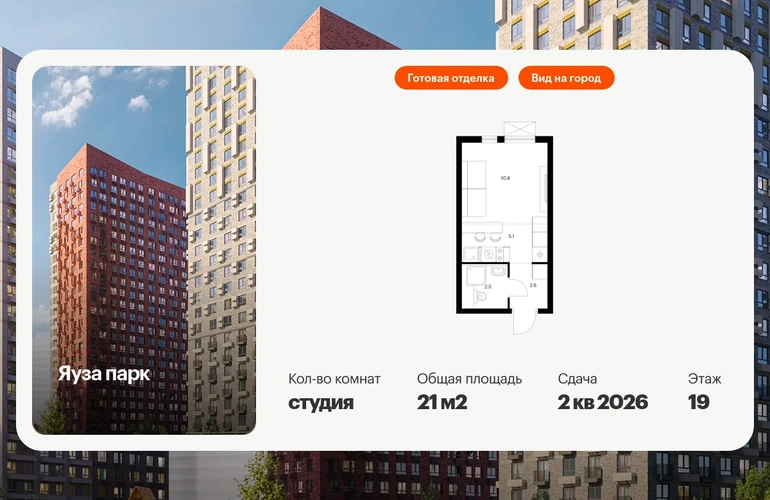 Продаётся квартира-студия площадью 21.00 кв.м на 19 этаже 24 этажного дома (Корпус 6, секция 1) проекта ПИК Яуза парк. Светлый просторный подъезд на уровне земли, функциональная планировка, большие окна, с отделкой. Жилой квартал «Яуза парк» возводится в Мытищах, в 5 минутах ходьбы от одноимённой ж/д станции. Проект включает 20 домов разной этажности с благоустроенными дворами-парками. Индивидуальный дизайн фасадов разработали архитектурные бюро KATARSIS и RHIZOME. Вблизи жилого квартала появятся шумопоглощающие экраны, позволяющие забыть о том, что неподалёку находятся железнодорожные пути. На первых этажах домов откроются магазины, кафе, салоны красоты и другие полезные сервисы. Рядом есть школы и детские сады, магазины и ТРЦ «Красный кит». На территории проекта появится благоустроенная набережная реки Яузы и пешеходный бульвар для прогулок всей семьёй. Водонапорную башню XIX века, расположенную на территории «Яуза парка», мы реставрируем и создадим вокруг неё общественное пространство для отдыха жителей квартала. Для прогулок отлично подойдёт Мытищинский центральный парк культуры и отдыха, расположенный в 10 минутах ходьбы, и Лосиный остров — в 24 минутах. Дорога на автомобиле до Ярославского шоссе займёт не более 3 минут, до МКАД — 10 минут. Артикул - 940933О застройщике