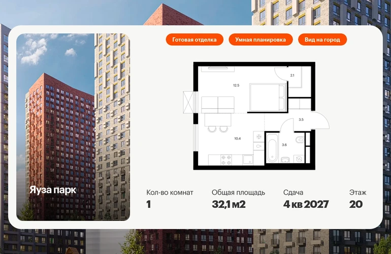 Продаётся 1-комн.квартира площадью 32.10 кв.м на 20 этаже 25 этажного дома (Корпус 9, секция 1) проекта ПИК Яуза парк. Светлый просторный подъезд на уровне земли, функциональная планировка, большие окна, с отделкой. Жилой квартал «Яуза парк» возводится в Мытищах, в 5 минутах ходьбы от одноимённой ж/д станции. Проект включает 20 домов разной этажности с благоустроенными дворами-парками. Индивидуальный дизайн фасадов разработали архитектурные бюро KATARSIS и RHIZOME. Вблизи жилого квартала появятся шумопоглощающие экраны, позволяющие забыть о том, что неподалёку находятся железнодорожные пути. На первых этажах домов откроются магазины, кафе, салоны красоты и другие полезные сервисы. Рядом есть школы и детские сады, магазины и ТРЦ «Красный кит». На территории проекта появится благоустроенная набережная реки Яузы и пешеходный бульвар для прогулок всей семьёй. Водонапорную башню XIX века, расположенную на территории «Яуза парка», мы реставрируем и создадим вокруг неё общественное пространство для отдыха жителей квартала. Для прогулок отлично подойдёт Мытищинский центральный парк культуры и отдыха, расположенный в 10 минутах ходьбы, и Лосиный остров — в 24 минутах. Дорога на автомобиле до Ярославского шоссе займёт не более 3 минут, до МКАД — 10 минут. Артикул - 998332О застройщике