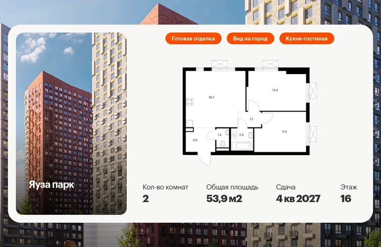 Продаётся 2-комн.квартира площадью 53.90 кв.м на 16 этаже 24 этажного дома (Корпус 7, секция 1) проекта ПИК Яуза парк. Светлый просторный подъезд на уровне земли, функциональная планировка, большие окна, с отделкой. Жилой квартал «Яуза парк» возводится в Мытищах, в 5 минутах ходьбы от одноимённой ж/д станции. Проект включает 20 домов разной этажности с благоустроенными дворами-парками. Индивидуальный дизайн фасадов разработали архитектурные бюро KATARSIS и RHIZOME. Вблизи жилого квартала появятся шумопоглощающие экраны, позволяющие забыть о том, что неподалёку находятся железнодорожные пути. На первых этажах домов откроются магазины, кафе, салоны красоты и другие полезные сервисы. Рядом есть школы и детские сады, магазины и ТРЦ «Красный кит». На территории проекта появится благоустроенная набережная реки Яузы и пешеходный бульвар для прогулок всей семьёй. Водонапорную башню XIX века, расположенную на территории «Яуза парка», мы реставрируем и создадим вокруг неё общественное пространство для отдыха жителей квартала. Для прогулок отлично подойдёт Мытищинский центральный парк культуры и отдыха, расположенный в 10 минутах ходьбы, и Лосиный остров — в 24 минутах. Дорога на автомобиле до Ярославского шоссе займёт не более 3 минут, до МКАД — 10 минут. Артикул - 996088О застройщике