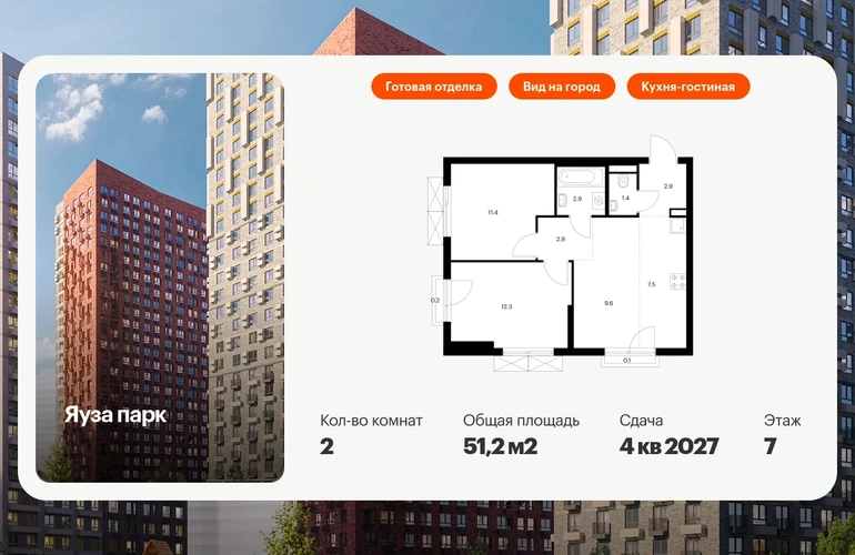 Продаётся 2-комн.квартира площадью 51.20 кв.м на 7 этаже 24 этажного дома (Корпус 7, секция 1) проекта ПИК Яуза парк. Светлый просторный подъезд на уровне земли, функциональная планировка, большие окна, с отделкой. Жилой квартал «Яуза парк» возводится в Мытищах, в 5 минутах ходьбы от одноимённой ж/д станции. Проект включает 20 домов разной этажности с благоустроенными дворами-парками. Индивидуальный дизайн фасадов разработали архитектурные бюро KATARSIS и RHIZOME. Вблизи жилого квартала появятся шумопоглощающие экраны, позволяющие забыть о том, что неподалёку находятся железнодорожные пути. На первых этажах домов откроются магазины, кафе, салоны красоты и другие полезные сервисы. Рядом есть школы и детские сады, магазины и ТРЦ «Красный кит». На территории проекта появится благоустроенная набережная реки Яузы и пешеходный бульвар для прогулок всей семьёй. Водонапорную башню XIX века, расположенную на территории «Яуза парка», мы реставрируем и создадим вокруг неё общественное пространство для отдыха жителей квартала. Для прогулок отлично подойдёт Мытищинский центральный парк культуры и отдыха, расположенный в 10 минутах ходьбы, и Лосиный остров — в 24 минутах. Дорога на автомобиле до Ярославского шоссе займёт не более 3 минут, до МКАД — 10 минут. Артикул - 995945О застройщике