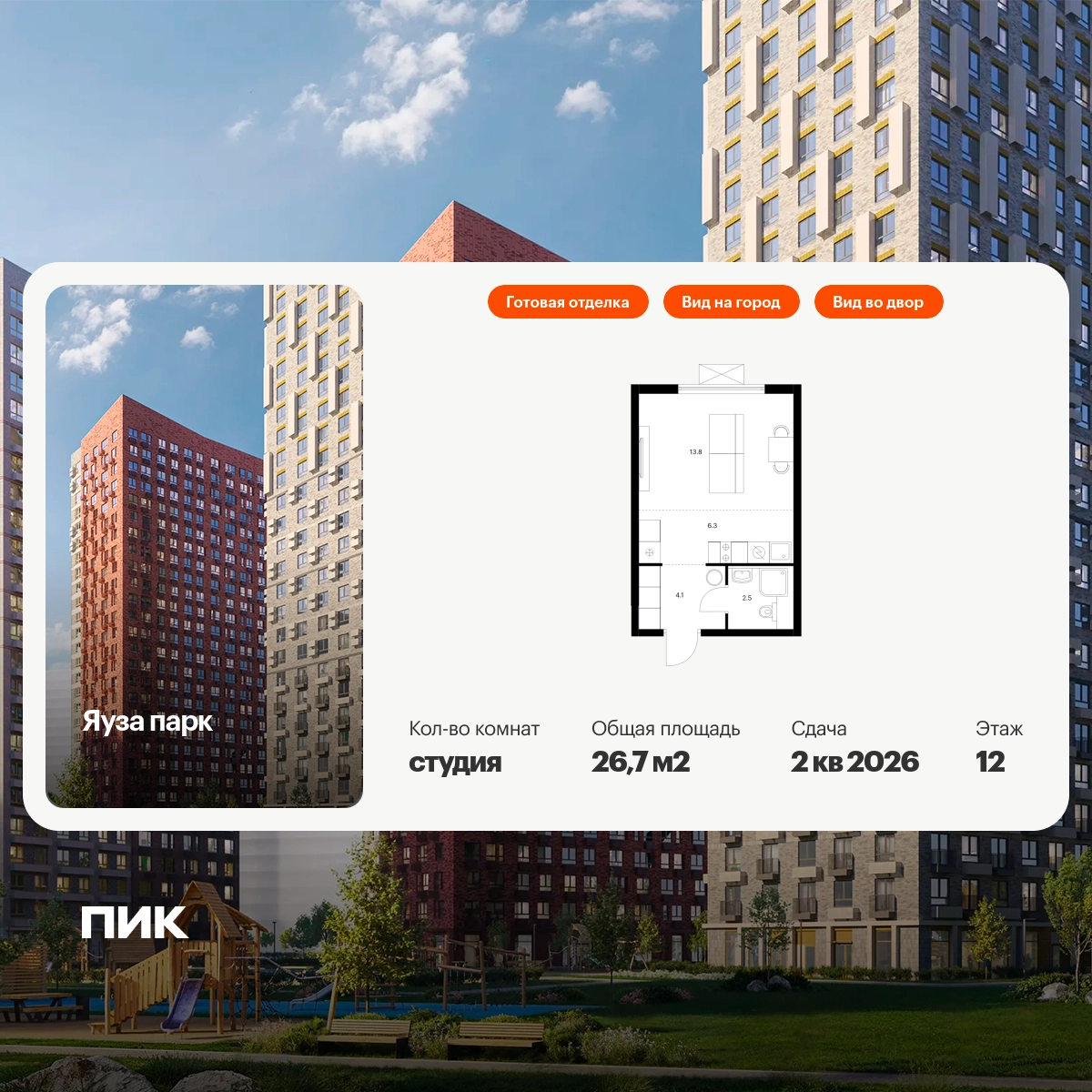 Продаётся квартира-студия площадью 26.70 кв.м на 12 этаже 24 этажного дома (Корпус 5, секция 1) проекта ПИК Яуза парк. Светлый просторный подъезд на уровне земли, функциональная планировка, большие окна, с отделкой. Жилой квартал «Яуза парк» возводится в Мытищах, в 5 минутах ходьбы от одноимённой ж/д станции. Проект включает 20 домов разной этажности с благоустроенными дворами-парками. Индивидуальный дизайн фасадов разработали архитектурные бюро KATARSIS и RHIZOME. Вблизи жилого квартала появятся шумопоглощающие экраны, позволяющие забыть о том, что неподалёку находятся железнодорожные пути. На первых этажах домов откроются магазины, кафе, салоны красоты и другие полезные сервисы. Рядом есть школы и детские сады, магазины и ТРЦ «Красный кит». На территории проекта появится благоустроенная набережная реки Яузы и пешеходный бульвар для прогулок всей семьёй. Водонапорную башню XIX века, расположенную на территории «Яуза парка», мы реставрируем и создадим вокруг неё общественное пространство для отдыха жителей квартала. Для прогулок отлично подойдёт Мытищинский центральный парк культуры и отдыха, расположенный в 10 минутах ходьбы, и Лосиный остров — в 24 минутах. Дорога на автомобиле до Ярославского шоссе займёт не более 3 минут, до МКАД — 10 минут. Артикул - 940443О застройщике