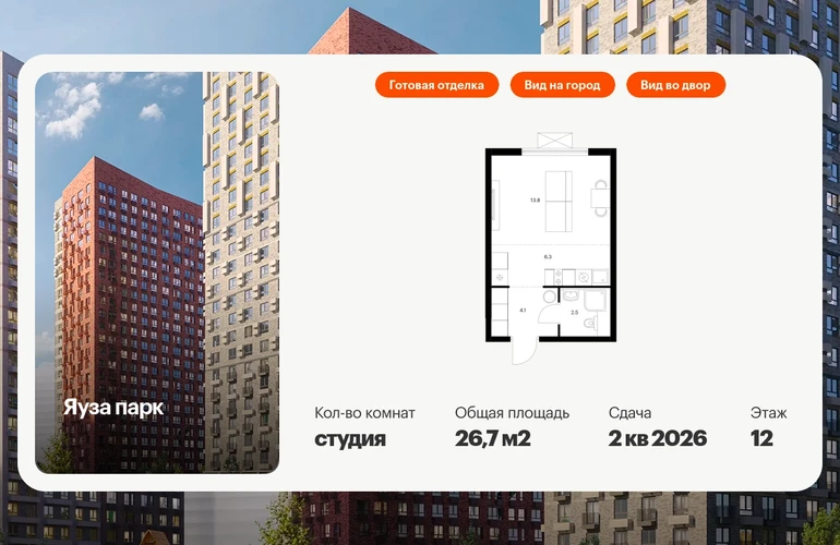 Продаётся квартира-студия площадью 26.70 кв.м на 12 этаже 24 этажного дома (Корпус 5, секция 1) проекта ПИК Яуза парк. Светлый просторный подъезд на уровне земли, функциональная планировка, большие окна, с отделкой. Жилой квартал «Яуза парк» возводится в Мытищах, в 5 минутах ходьбы от одноимённой ж/д станции. Проект включает 20 домов разной этажности с благоустроенными дворами-парками. Индивидуальный дизайн фасадов разработали архитектурные бюро KATARSIS и RHIZOME. Вблизи жилого квартала появятся шумопоглощающие экраны, позволяющие забыть о том, что неподалёку находятся железнодорожные пути. На первых этажах домов откроются магазины, кафе, салоны красоты и другие полезные сервисы. Рядом есть школы и детские сады, магазины и ТРЦ «Красный кит». На территории проекта появится благоустроенная набережная реки Яузы и пешеходный бульвар для прогулок всей семьёй. Водонапорную башню XIX века, расположенную на территории «Яуза парка», мы реставрируем и создадим вокруг неё общественное пространство для отдыха жителей квартала. Для прогулок отлично подойдёт Мытищинский центральный парк культуры и отдыха, расположенный в 10 минутах ходьбы, и Лосиный остров — в 24 минутах. Дорога на автомобиле до Ярославского шоссе займёт не более 3 минут, до МКАД — 10 минут. Артикул - 940443О застройщике