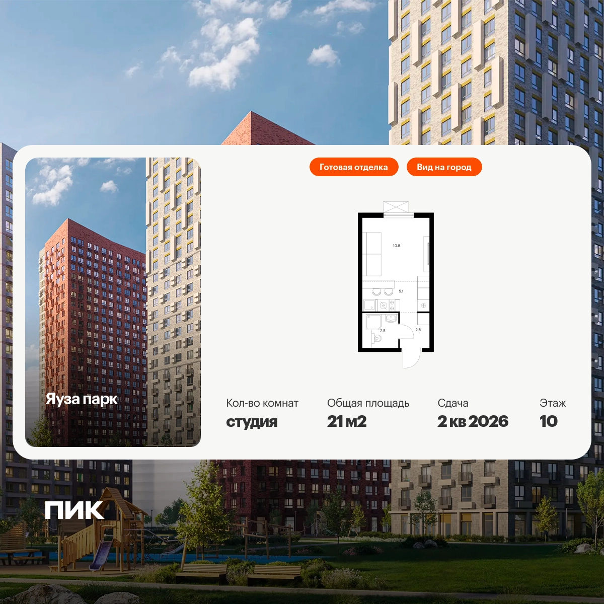 Продаётся квартира-студия площадью 21.00 кв.м на 10 этаже 24 этажного дома (Корпус 6, секция 1) проекта ПИК Яуза парк. Светлый просторный подъезд на уровне земли, функциональная планировка, большие окна, с отделкой. Жилой квартал «Яуза парк» возводится в Мытищах, в 5 минутах ходьбы от одноимённой ж/д станции. Проект включает 20 домов разной этажности с благоустроенными дворами-парками. Индивидуальный дизайн фасадов разработали архитектурные бюро KATARSIS и RHIZOME. Вблизи жилого квартала появятся шумопоглощающие экраны, позволяющие забыть о том, что неподалёку находятся железнодорожные пути. На первых этажах домов откроются магазины, кафе, салоны красоты и другие полезные сервисы. Рядом есть школы и детские сады, магазины и ТРЦ «Красный кит». На территории проекта появится благоустроенная набережная реки Яузы и пешеходный бульвар для прогулок всей семьёй. Водонапорную башню XIX века, расположенную на территории «Яуза парка», мы реставрируем и создадим вокруг неё общественное пространство для отдыха жителей квартала. Для прогулок отлично подойдёт Мытищинский центральный парк культуры и отдыха, расположенный в 10 минутах ходьбы, и Лосиный остров — в 24 минутах. Дорога на автомобиле до Ярославского шоссе займёт не более 3 минут, до МКАД — 10 минут. Артикул - 940789О застройщике