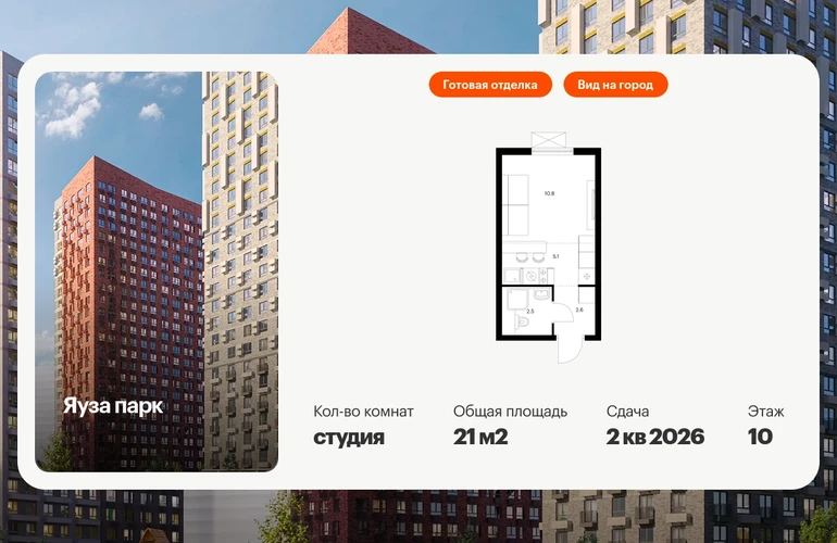 Продаётся квартира-студия площадью 21.00 кв.м на 10 этаже 24 этажного дома (Корпус 6, секция 1) проекта ПИК Яуза парк. Светлый просторный подъезд на уровне земли, функциональная планировка, большие окна, с отделкой. Жилой квартал «Яуза парк» возводится в Мытищах, в 5 минутах ходьбы от одноимённой ж/д станции. Проект включает 20 домов разной этажности с благоустроенными дворами-парками. Индивидуальный дизайн фасадов разработали архитектурные бюро KATARSIS и RHIZOME. Вблизи жилого квартала появятся шумопоглощающие экраны, позволяющие забыть о том, что неподалёку находятся железнодорожные пути. На первых этажах домов откроются магазины, кафе, салоны красоты и другие полезные сервисы. Рядом есть школы и детские сады, магазины и ТРЦ «Красный кит». На территории проекта появится благоустроенная набережная реки Яузы и пешеходный бульвар для прогулок всей семьёй. Водонапорную башню XIX века, расположенную на территории «Яуза парка», мы реставрируем и создадим вокруг неё общественное пространство для отдыха жителей квартала. Для прогулок отлично подойдёт Мытищинский центральный парк культуры и отдыха, расположенный в 10 минутах ходьбы, и Лосиный остров — в 24 минутах. Дорога на автомобиле до Ярославского шоссе займёт не более 3 минут, до МКАД — 10 минут. Артикул - 940789О застройщике