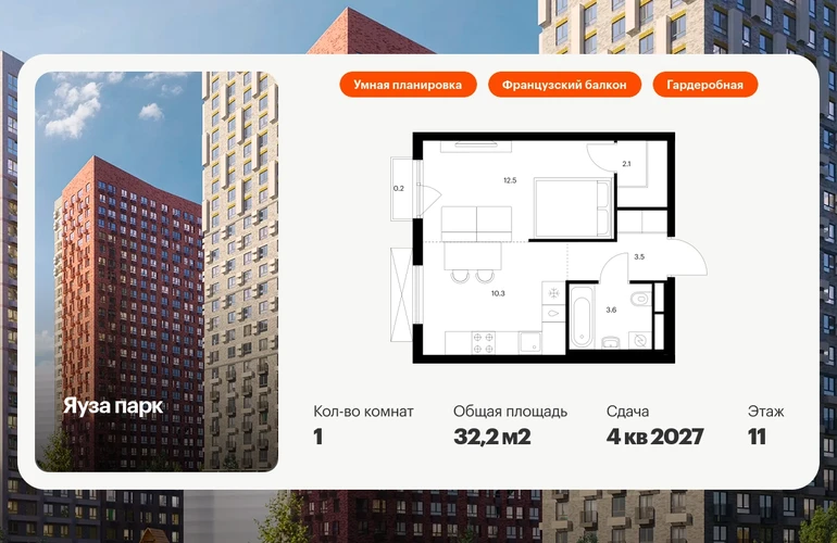 Продаётся 1-комн.квартира площадью 32.20 кв.м на 11 этаже 24 этажного дома (Корпус 10, секция 1) проекта ПИК Яуза парк. Светлый просторный подъезд на уровне земли, функциональная планировка, большие окна, с отделкой. Жилой квартал «Яуза парк» возводится в Мытищах, в 5 минутах ходьбы от одноимённой ж/д станции. Проект включает 20 домов разной этажности с благоустроенными дворами-парками. Индивидуальный дизайн фасадов разработали архитектурные бюро KATARSIS и RHIZOME. Вблизи жилого квартала появятся шумопоглощающие экраны, позволяющие забыть о том, что неподалёку находятся железнодорожные пути. На первых этажах домов откроются магазины, кафе, салоны красоты и другие полезные сервисы. Рядом есть школы и детские сады, магазины и ТРЦ «Красный кит». На территории проекта появится благоустроенная набережная реки Яузы и пешеходный бульвар для прогулок всей семьёй. Водонапорную башню XIX века, расположенную на территории «Яуза парка», мы реставрируем и создадим вокруг неё общественное пространство для отдыха жителей квартала. Для прогулок отлично подойдёт Мытищинский центральный парк культуры и отдыха, расположенный в 10 минутах ходьбы, и Лосиный остров — в 24 минутах. Дорога на автомобиле до Ярославского шоссе займёт не более 3 минут, до МКАД — 10 минут. Артикул - 999356О застройщике