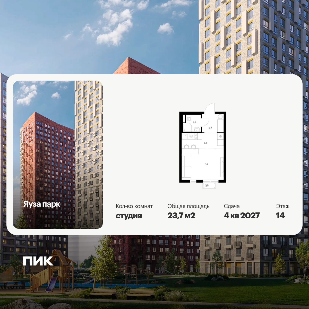Продаётся квартира-студия площадью 23.70 кв.м на 14 этаже 24 этажного дома (Корпус 12, секция 1) проекта ПИК Яуза парк. Светлый просторный подъезд на уровне земли, функциональная планировка, большие окна, с отделкой. Жилой квартал «Яуза парк» возводится в Мытищах, в 5 минутах ходьбы от одноимённой ж/д станции. Проект включает 20 домов разной этажности с благоустроенными дворами-парками. Индивидуальный дизайн фасадов разработали архитектурные бюро KATARSIS и RHIZOME. Вблизи жилого квартала появятся шумопоглощающие экраны, позволяющие забыть о том, что неподалёку находятся железнодорожные пути. На первых этажах домов откроются магазины, кафе, салоны красоты и другие полезные сервисы. Рядом есть школы и детские сады, магазины и ТРЦ «Красный кит». На территории проекта появится благоустроенная набережная реки Яузы и пешеходный бульвар для прогулок всей семьёй. Водонапорную башню XIX века, расположенную на территории «Яуза парка», мы реставрируем и создадим вокруг неё общественное пространство для отдыха жителей квартала. Для прогулок отлично подойдёт Мытищинский центральный парк культуры и отдыха, расположенный в 10 минутах ходьбы, и Лосиный остров — в 24 минутах. Дорога на автомобиле до Ярославского шоссе займёт не более 3 минут, до МКАД — 10 минут. Артикул - 1000762О застройщике