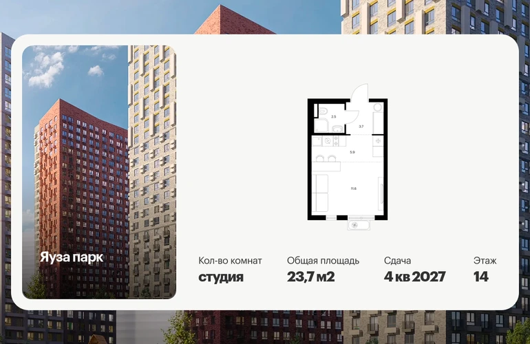 Продаётся квартира-студия площадью 23.70 кв.м на 14 этаже 24 этажного дома (Корпус 12, секция 1) проекта ПИК Яуза парк. Светлый просторный подъезд на уровне земли, функциональная планировка, большие окна, с отделкой. Жилой квартал «Яуза парк» возводится в Мытищах, в 5 минутах ходьбы от одноимённой ж/д станции. Проект включает 20 домов разной этажности с благоустроенными дворами-парками. Индивидуальный дизайн фасадов разработали архитектурные бюро KATARSIS и RHIZOME. Вблизи жилого квартала появятся шумопоглощающие экраны, позволяющие забыть о том, что неподалёку находятся железнодорожные пути. На первых этажах домов откроются магазины, кафе, салоны красоты и другие полезные сервисы. Рядом есть школы и детские сады, магазины и ТРЦ «Красный кит». На территории проекта появится благоустроенная набережная реки Яузы и пешеходный бульвар для прогулок всей семьёй. Водонапорную башню XIX века, расположенную на территории «Яуза парка», мы реставрируем и создадим вокруг неё общественное пространство для отдыха жителей квартала. Для прогулок отлично подойдёт Мытищинский центральный парк культуры и отдыха, расположенный в 10 минутах ходьбы, и Лосиный остров — в 24 минутах. Дорога на автомобиле до Ярославского шоссе займёт не более 3 минут, до МКАД — 10 минут. Артикул - 1000762О застройщике