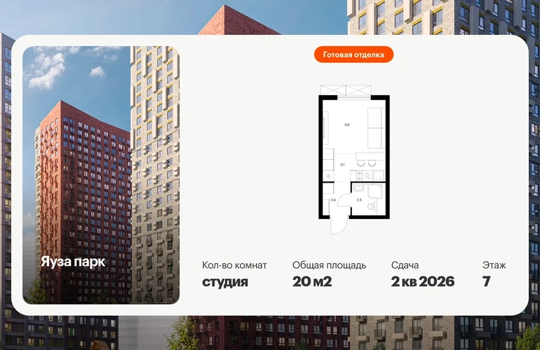 Продаётся квартира-студия площадью 20.00 кв.м на 7 этаже 24 этажного дома (Корпус 5, секция 1) проекта ПИК Яуза парк. Светлый просторный подъезд на уровне земли, функциональная планировка, большие окна, с отделкой. Жилой квартал «Яуза парк» возводится в Мытищах, в 5 минутах ходьбы от одноимённой ж/д станции. Проект включает 20 домов разной этажности с благоустроенными дворами-парками. Индивидуальный дизайн фасадов разработали архитектурные бюро KATARSIS и RHIZOME. Вблизи жилого квартала появятся шумопоглощающие экраны, позволяющие забыть о том, что неподалёку находятся железнодорожные пути. На первых этажах домов откроются магазины, кафе, салоны красоты и другие полезные сервисы. Рядом есть школы и детские сады, магазины и ТРЦ «Красный кит». На территории проекта появится благоустроенная набережная реки Яузы и пешеходный бульвар для прогулок всей семьёй. Водонапорную башню XIX века, расположенную на территории «Яуза парка», мы реставрируем и создадим вокруг неё общественное пространство для отдыха жителей квартала. Для прогулок отлично подойдёт Мытищинский центральный парк культуры и отдыха, расположенный в 10 минутах ходьбы, и Лосиный остров — в 24 минутах. Дорога на автомобиле до Ярославского шоссе займёт не более 3 минут, до МКАД — 10 минут. Артикул - 940366О застройщике
