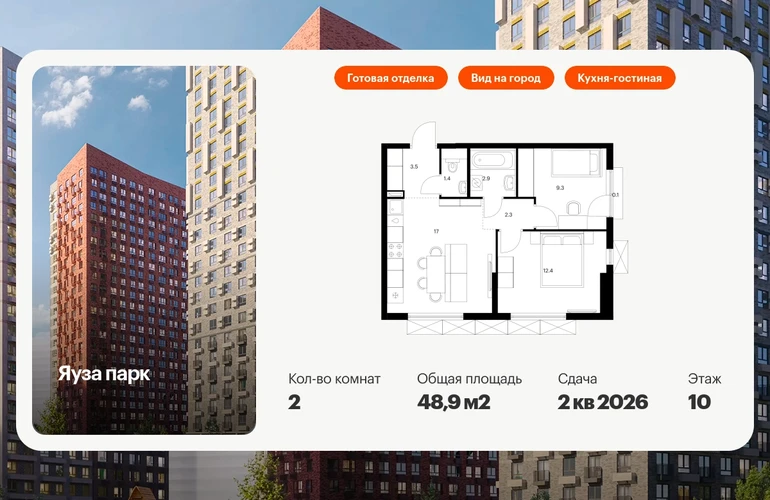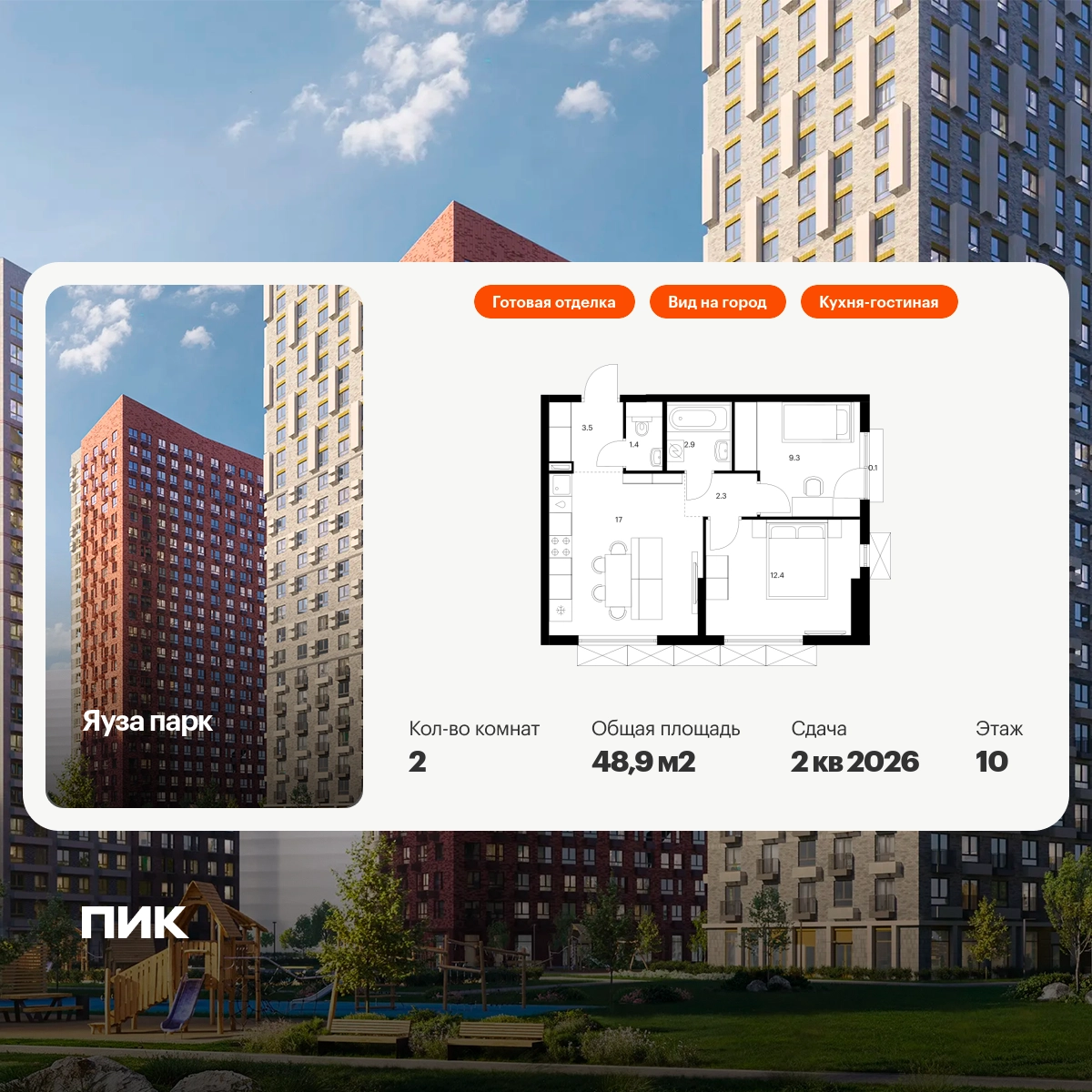 Продаётся 2-комн.квартира площадью 48.90 кв.м на 10 этаже 24 этажного дома (Корпус 5, секция 1) проекта ПИК Яуза парк. Светлый просторный подъезд на уровне земли, функциональная планировка, большие окна, с отделкой. Жилой квартал «Яуза парк» возводится в Мытищах, в 5 минутах ходьбы от одноимённой ж/д станции. Проект включает 20 домов разной этажности с благоустроенными дворами-парками. Индивидуальный дизайн фасадов разработали архитектурные бюро KATARSIS и RHIZOME. Вблизи жилого квартала появятся шумопоглощающие экраны, позволяющие забыть о том, что неподалёку находятся железнодорожные пути. На первых этажах домов откроются магазины, кафе, салоны красоты и другие полезные сервисы. Рядом есть школы и детские сады, магазины и ТРЦ «Красный кит». На территории проекта появится благоустроенная набережная реки Яузы и пешеходный бульвар для прогулок всей семьёй. Водонапорную башню XIX века, расположенную на территории «Яуза парка», мы реставрируем и создадим вокруг неё общественное пространство для отдыха жителей квартала. Для прогулок отлично подойдёт Мытищинский центральный парк культуры и отдыха, расположенный в 10 минутах ходьбы, и Лосиный остров — в 24 минутах. Дорога на автомобиле до Ярославского шоссе займёт не более 3 минут, до МКАД — 10 минут. Артикул - 940403О застройщике