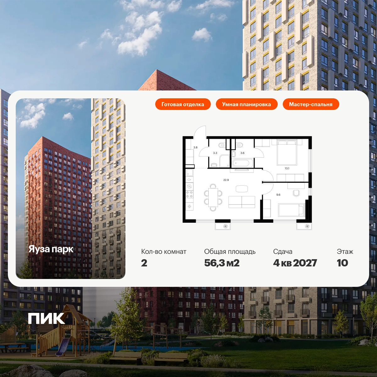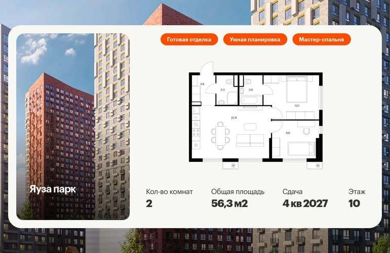 Продаётся 2-комн.квартира площадью 56.30 кв.м на 10 этаже 25 этажного дома (Корпус 11, секция 1) проекта ПИК Яуза парк. Светлый просторный подъезд на уровне земли, функциональная планировка, большие окна, с отделкой. Жилой квартал «Яуза парк» возводится в Мытищах, в 5 минутах ходьбы от одноимённой ж/д станции. Проект включает 20 домов разной этажности с благоустроенными дворами-парками. Индивидуальный дизайн фасадов разработали архитектурные бюро KATARSIS и RHIZOME. Вблизи жилого квартала появятся шумопоглощающие экраны, позволяющие забыть о том, что неподалёку находятся железнодорожные пути. На первых этажах домов откроются магазины, кафе, салоны красоты и другие полезные сервисы. Рядом есть школы и детские сады, магазины и ТРЦ «Красный кит». На территории проекта появится благоустроенная набережная реки Яузы и пешеходный бульвар для прогулок всей семьёй. Водонапорную башню XIX века, расположенную на территории «Яуза парка», мы реставрируем и создадим вокруг неё общественное пространство для отдыха жителей квартала. Для прогулок отлично подойдёт Мытищинский центральный парк культуры и отдыха, расположенный в 10 минутах ходьбы, и Лосиный остров — в 24 минутах. Дорога на автомобиле до Ярославского шоссе займёт не более 3 минут, до МКАД — 10 минут. Артикул - 1000136О застройщике