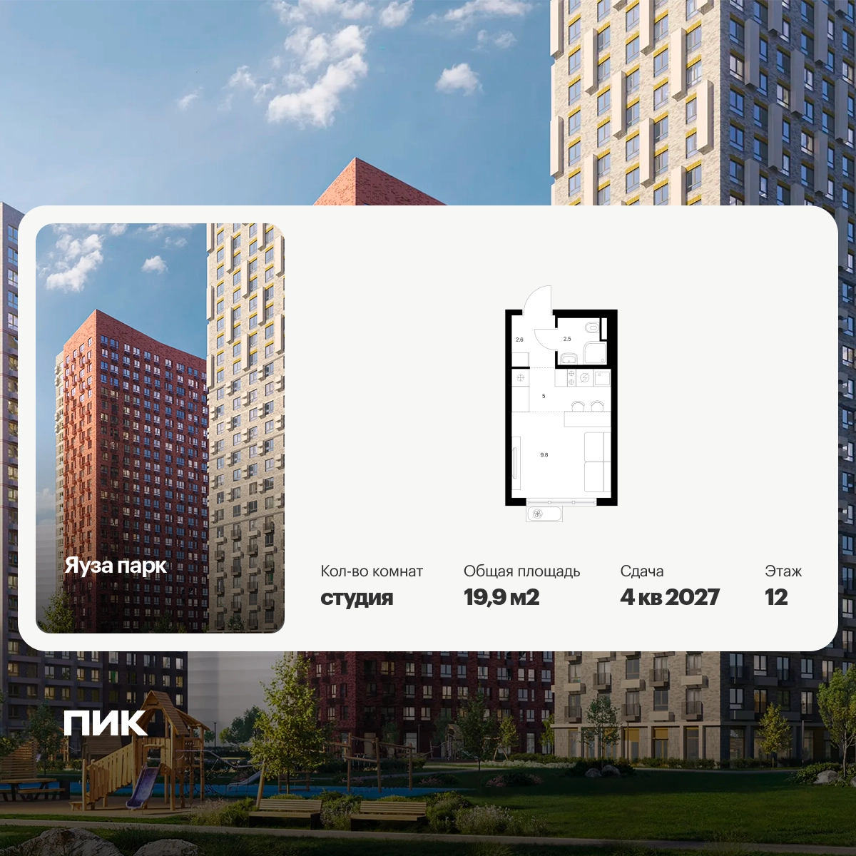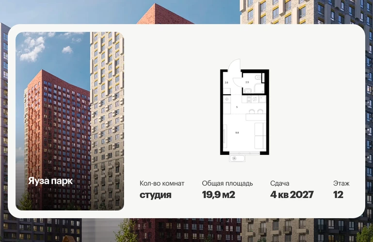 Продаётся квартира-студия площадью 19.90 кв.м на 12 этаже 24 этажного дома (Корпус 12, секция 1) проекта ПИК Яуза парк. Светлый просторный подъезд на уровне земли, функциональная планировка, большие окна, с отделкой. Жилой квартал «Яуза парк» возводится в Мытищах, в 5 минутах ходьбы от одноимённой ж/д станции. Проект включает 20 домов разной этажности с благоустроенными дворами-парками. Индивидуальный дизайн фасадов разработали архитектурные бюро KATARSIS и RHIZOME. Вблизи жилого квартала появятся шумопоглощающие экраны, позволяющие забыть о том, что неподалёку находятся железнодорожные пути. На первых этажах домов откроются магазины, кафе, салоны красоты и другие полезные сервисы. Рядом есть школы и детские сады, магазины и ТРЦ «Красный кит». На территории проекта появится благоустроенная набережная реки Яузы и пешеходный бульвар для прогулок всей семьёй. Водонапорную башню XIX века, расположенную на территории «Яуза парка», мы реставрируем и создадим вокруг неё общественное пространство для отдыха жителей квартала. Для прогулок отлично подойдёт Мытищинский центральный парк культуры и отдыха, расположенный в 10 минутах ходьбы, и Лосиный остров — в 24 минутах. Дорога на автомобиле до Ярославского шоссе займёт не более 3 минут, до МКАД — 10 минут. Артикул - 1000738О застройщике