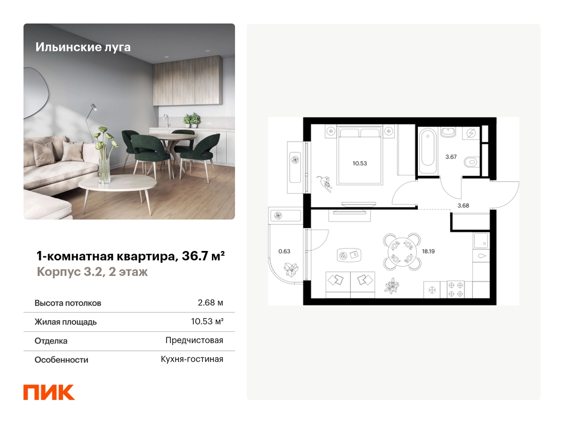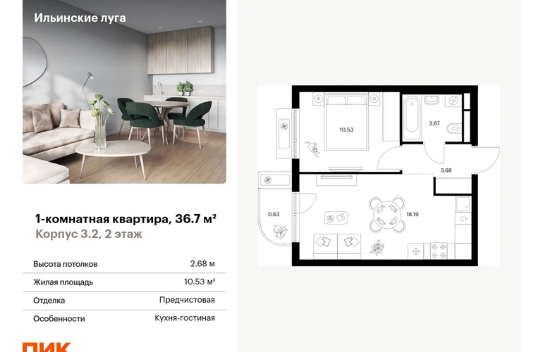 Продаётся 1-комн.квартира площадью 36.70 кв.м на 2 этаже 9 этажного дома (Корпус 3.2, секция 1) проекта ПИК Ильинские луга. Светлый просторный подъезд на уровне земли, функциональная планировка, большие окна, с отделкой. Жилой район «Ильинские луга» находится в 10 километрах от МКАД по Новорижскому шоссе, в 20 минутах на автомобиле от станций метро «Волоколамская», «Тушинская» и «Строгино». В будущем ближе к проекту, в 9 минутах пути на машине, откроется станция «Ильинская» Рублёво-Архангельской линии, которая будет соединять Арбатско-Покровскую линию и Большую кольцевую линию. «Ильинские луга» — масштабный проект, в который входит девять детских садов, четыре школы и поликлиника. Он строится в престижном и экологичном районе среди лесов и памятников природы. За 5 минут от жилого квартала можно доехать до Рублёво-Успенского шоссе, а за 30 минут — до центра Москвы. До крупного торгового центра «РИГАМОЛЛ» всего 5 минут на автомобиле, а до ТЦ «Твой дом» и гипермаркета «Глобус» — 10 минут. В «Ильинских лугах» строятся только девятиэтажные дома — такая архитектура соответствует спокойной жизни за городом. В каждом дворе-парке есть места для отдыха, детские и спортивные площадки. А ещё, здесь уже открыт большой PlayHub «Гравити» — современное игровое пространство с космической тематикой, холмами, зонами для игр и отдыха жителей любого возраста. На первых этажах уже работают магазины, кафе и пекарни. Места для отдыха от «Ильинских лугов» тоже недалеко: 10 минут на машине — и вы в музее-усадьбе «Архангельское». Также рядом находится Лохин остров — памятник природы, где водятся речные черепахи, есть места для кемпинга и возможность сплавиться по реке. Артикул - 999546О застройщике