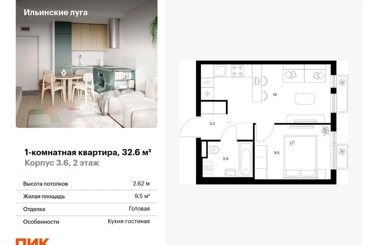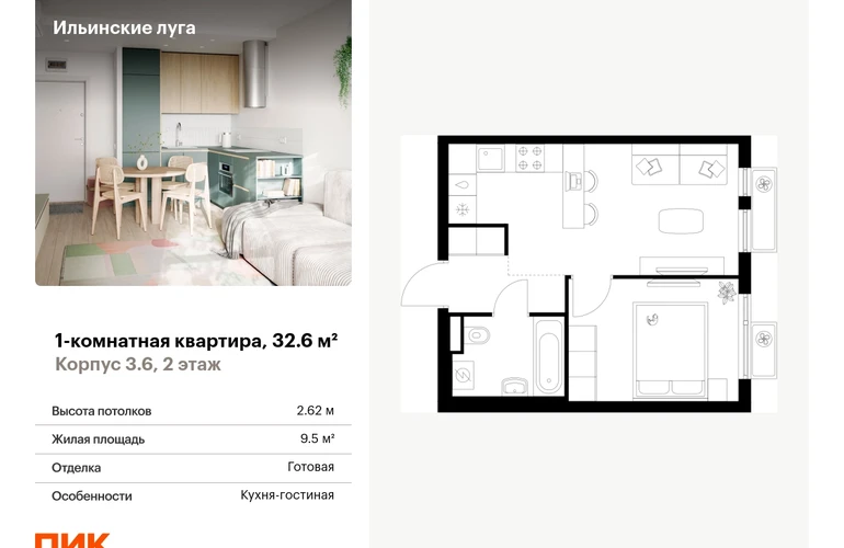 Продаётся 1-комн.квартира площадью 32.60 кв.м на 2 этаже 9 этажного дома (Корпус 3.6, секция 1) проекта ПИК Ильинские луга. Светлый просторный подъезд на уровне земли, функциональная планировка, большие окна, с отделкой. <br> <br>Жилой район «Ильинские луга» находится в 10 километрах от МКАД по Новорижскому шоссе, в 20 минутах на автомобиле от станций метро «Волоколамская», «Тушинская» и «Строгино». В будущем ближе к проекту, в 9 минутах пути на машине, откроется станция «Ильинская» Рублёво-Архангельской линии, которая будет соединять Арбатско-Покровскую линию и Большую кольцевую линию. <br> <br>«Ильинские луга» — масштабный проект, в который входит девять детских садов, четыре школы и поликлиника. Он строится в престижном и экологичном районе среди лесов и памятников природы. За 5 минут от жилого квартала можно доехать до Рублёво-Успенского шоссе, а за 30 минут — до центра Москвы. До крупного торгового центра «РИГАМОЛЛ» всего 5 минут на автомобиле, а до ТЦ «Твой дом» и гипермаркета «Глобус» — 10 минут. <br> <br>В «Ильинских лугах» строятся только девятиэтажные дома — такая архитектура соответствует спокойной жизни за городом. В каждом дворе-парке есть места для отдыха, детские и спортивные площадки. А ещё, здесь уже открыт большой PlayHub «Гравити» — современное игровое пространство с космической тематикой, холмами, зонами для игр и отдыха жителей любого возраста. <br> <br>На первых этажах уже работают магазины, кафе и пекарни. <br> <br>Места для отдыха от «Ильинских лугов» тоже недалеко: 10 минут на машине — и вы в музее-усадьбе «Архангельское». Также рядом находится Лохин остров — памятник природы, где водятся речные черепахи, есть места для кемпинга и возможность сплавиться по реке. Артикул - 991485О застройщике