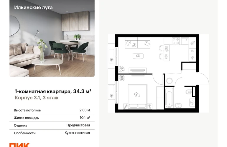 Продаётся 1-комн.квартира площадью 34.30 кв.м на 3 этаже 9 этажного дома (Корпус 3.1, секция 1) проекта ПИК Ильинские луга. Светлый просторный подъезд на уровне земли, функциональная планировка, большие окна, с отделкой. Жилой район «Ильинские луга» находится в 10 километрах от МКАД по Новорижскому шоссе, в 20 минутах на автомобиле от станций метро «Волоколамская», «Тушинская» и «Строгино». В будущем ближе к проекту, в 9 минутах пути на машине, откроется станция «Ильинская» Рублёво-Архангельской линии, которая будет соединять Арбатско-Покровскую линию и Большую кольцевую линию. «Ильинские луга» — масштабный проект, в который входит девять детских садов, четыре школы и поликлиника. Он строится в престижном и экологичном районе среди лесов и памятников природы. За 5 минут от жилого квартала можно доехать до Рублёво-Успенского шоссе, а за 30 минут — до центра Москвы. До крупного торгового центра «РИГАМОЛЛ» всего 5 минут на автомобиле, а до ТЦ «Твой дом» и гипермаркета «Глобус» — 10 минут. В «Ильинских лугах» строятся только девятиэтажные дома — такая архитектура соответствует спокойной жизни за городом. В каждом дворе-парке есть места для отдыха, детские и спортивные площадки. А ещё, здесь уже открыт большой PlayHub «Гравити» — современное игровое пространство с космической тематикой, холмами, зонами для игр и отдыха жителей любого возраста. На первых этажах уже работают магазины, кафе и пекарни. Места для отдыха от «Ильинских лугов» тоже недалеко: 10 минут на машине — и вы в музее-усадьбе «Архангельское». Также рядом находится Лохин остров — памятник природы, где водятся речные черепахи, есть места для кемпинга и возможность сплавиться по реке. Артикул - 1001249О застройщике