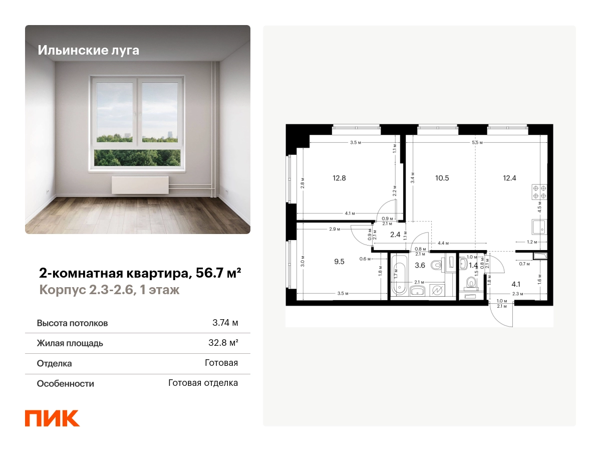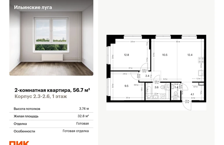 Продаётся 2-комн.квартира площадью 56.70 кв.м на 1 этаже 9 этажного дома (Корпус 2.3-2.6, секция 3) проекта ПИК Ильинские луга. Светлый просторный подъезд на уровне земли, функциональная планировка, большие окна, с отделкой. <br> <br>Жилой район «Ильинские луга» находится в 10 километрах от МКАД по Новорижскому шоссе, в 20 минутах на автомобиле от станций метро «Волоколамская», «Тушинская» и «Строгино». В будущем ближе к проекту, в 9 минутах пути на машине, откроется станция «Ильинская» Рублёво-Архангельской линии, которая будет соединять Арбатско-Покровскую линию и Большую кольцевую линию. <br> <br>«Ильинские луга» — масштабный проект, в который входит девять детских садов, четыре школы и поликлиника. Он строится в престижном и экологичном районе среди лесов и памятников природы. За 5 минут от жилого квартала можно доехать до Рублёво-Успенского шоссе, а за 30 минут — до центра Москвы. До крупного торгового центра «РИГАМОЛЛ» всего 5 минут на автомобиле, а до ТЦ «Твой дом» и гипермаркета «Глобус» — 10 минут. <br> <br>В «Ильинских лугах» строятся только девятиэтажные дома — такая архитектура соответствует спокойной жизни за городом. В каждом дворе-парке есть места для отдыха, детские и спортивные площадки. А ещё, здесь уже открыт большой PlayHub «Гравити» — современное игровое пространство с космической тематикой, холмами, зонами для игр и отдыха жителей любого возраста. <br> <br>На первых этажах уже работают магазины, кафе и пекарни. <br> <br>Места для отдыха от «Ильинских лугов» тоже недалеко: 10 минут на машине — и вы в музее-усадьбе «Архангельское». Также рядом находится Лохин остров — памятник природы, где водятся речные черепахи, есть места для кемпинга и возможность сплавиться по реке. Артикул - 876896О застройщике