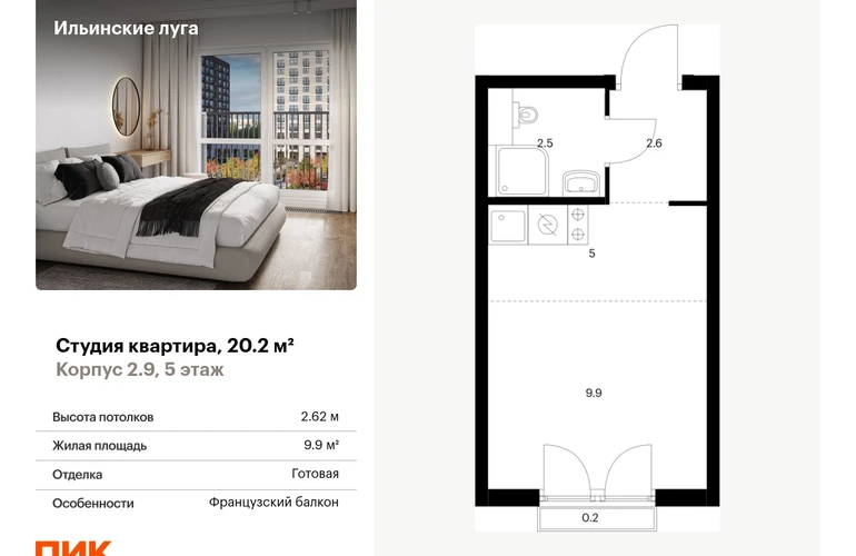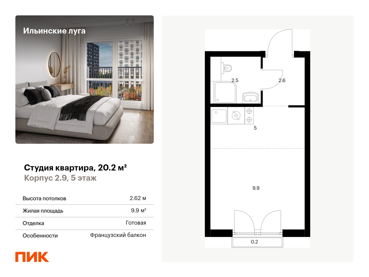Продаётся квартира-студия площадью 20.20 кв.м на 5 этаже 9 этажного дома (Корпус 2.9, секция 2) проекта ПИК Ильинские луга. Светлый просторный подъезд на уровне земли, функциональная планировка, большие окна, с отделкой. Жилой район «Ильинские луга» находится в 10 километрах от МКАД по Новорижскому шоссе, в 20 минутах на автомобиле от станций метро «Волоколамская», «Тушинская» и «Строгино». В будущем ближе к проекту, в 9 минутах пути на машине, откроется станция «Ильинская» Рублёво-Архангельской линии, которая будет соединять Арбатско-Покровскую линию и Большую кольцевую линию. «Ильинские луга» — масштабный проект, в который входит девять детских садов, четыре школы и поликлиника. Он строится в престижном и экологичном районе среди лесов и памятников природы. За 5 минут от жилого квартала можно доехать до Рублёво-Успенского шоссе, а за 30 минут — до центра Москвы. До крупного торгового центра «РИГАМОЛЛ» всего 5 минут на автомобиле, а до ТЦ «Твой дом» и гипермаркета «Глобус» — 10 минут. В «Ильинских лугах» строятся только девятиэтажные дома — такая архитектура соответствует спокойной жизни за городом. В каждом дворе-парке есть места для отдыха, детские и спортивные площадки. А ещё, здесь уже открыт большой PlayHub «Гравити» — современное игровое пространство с космической тематикой, холмами, зонами для игр и отдыха жителей любого возраста. На первых этажах уже работают магазины, кафе и пекарни. Места для отдыха от «Ильинских лугов» тоже недалеко: 10 минут на машине — и вы в музее-усадьбе «Архангельское». Также рядом находится Лохин остров — памятник природы, где водятся речные черепахи, есть места для кемпинга и возможность сплавиться по реке. Артикул - 933971О застройщике