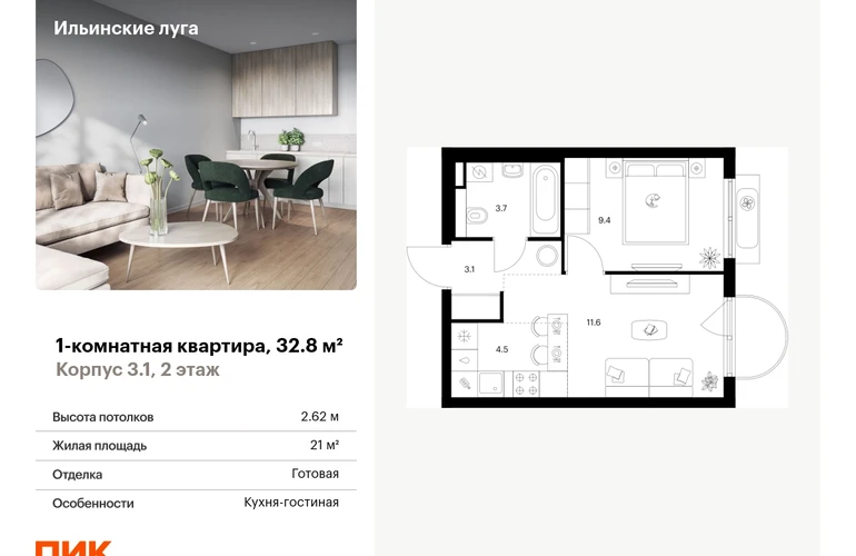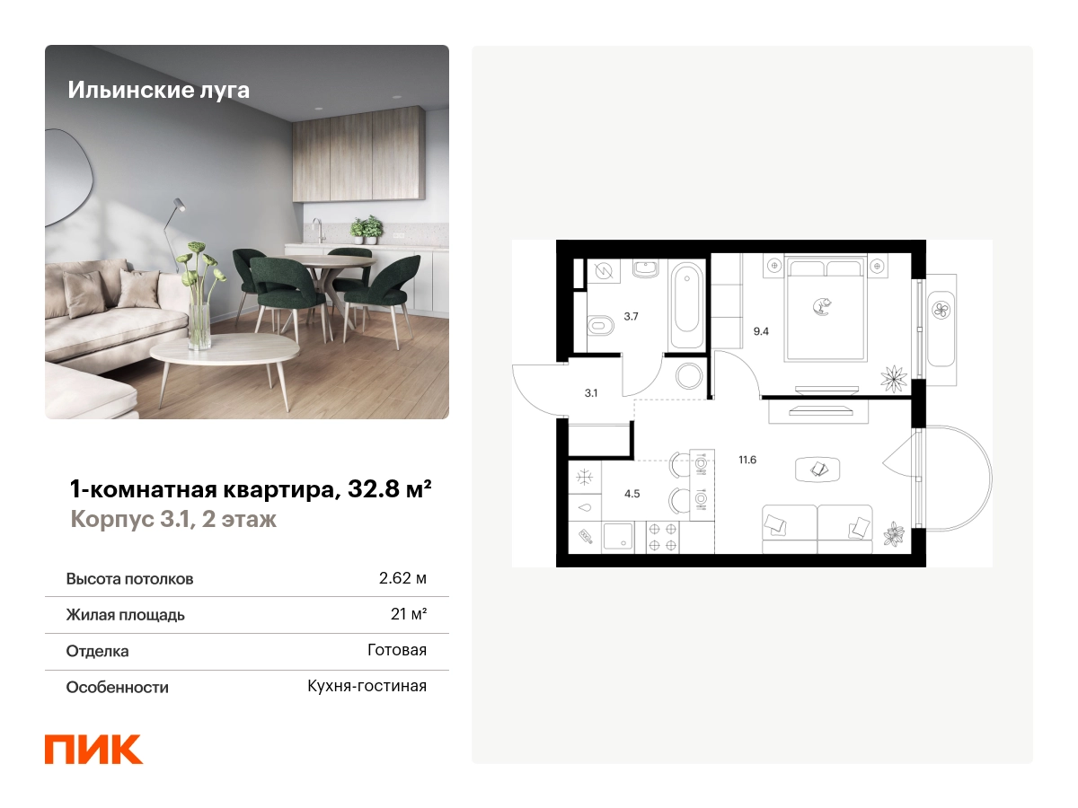 Продаётся 1-комн.квартира площадью 32.80 кв.м на 2 этаже 9 этажного дома (Корпус 3.1, секция 2) проекта ПИК Ильинские луга. Светлый просторный подъезд на уровне земли, функциональная планировка, большие окна, с отделкой. Жилой район «Ильинские луга» находится в 10 километрах от МКАД по Новорижскому шоссе, в 20 минутах на автомобиле от станций метро «Волоколамская», «Тушинская» и «Строгино». В будущем ближе к проекту, в 9 минутах пути на машине, откроется станция «Ильинская» Рублёво-Архангельской линии, которая будет соединять Арбатско-Покровскую линию и Большую кольцевую линию. «Ильинские луга» — масштабный проект, в который входит девять детских садов, четыре школы и поликлиника. Он строится в престижном и экологичном районе среди лесов и памятников природы. За 5 минут от жилого квартала можно доехать до Рублёво-Успенского шоссе, а за 30 минут — до центра Москвы. До крупного торгового центра «РИГАМОЛЛ» всего 5 минут на автомобиле, а до ТЦ «Твой дом» и гипермаркета «Глобус» — 10 минут. В «Ильинских лугах» строятся только девятиэтажные дома — такая архитектура соответствует спокойной жизни за городом. В каждом дворе-парке есть места для отдыха, детские и спортивные площадки. А ещё, здесь уже открыт большой PlayHub «Гравити» — современное игровое пространство с космической тематикой, холмами, зонами для игр и отдыха жителей любого возраста. На первых этажах уже работают магазины, кафе и пекарни. Места для отдыха от «Ильинских лугов» тоже недалеко: 10 минут на машине — и вы в музее-усадьбе «Архангельское». Также рядом находится Лохин остров — памятник природы, где водятся речные черепахи, есть места для кемпинга и возможность сплавиться по реке. Артикул - 1001400О застройщике
