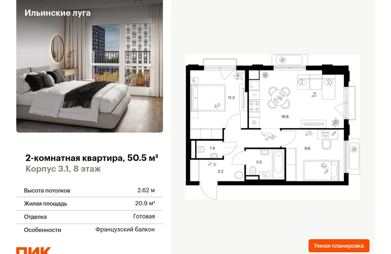 Продаётся 2-комн.квартира площадью 50.50 кв.м на 8 этаже 9 этажного дома (Корпус 3.1, секция 3) проекта ПИК Ильинские луга. Светлый просторный подъезд на уровне земли, функциональная планировка, большие окна, с отделкой. Жилой район «Ильинские луга» находится в 10 километрах от МКАД по Новорижскому шоссе, в 20 минутах на автомобиле от станций метро «Волоколамская», «Тушинская» и «Строгино». В будущем ближе к проекту, в 9 минутах пути на машине, откроется станция «Ильинская» Рублёво-Архангельской линии, которая будет соединять Арбатско-Покровскую линию и Большую кольцевую линию. «Ильинские луга» — масштабный проект, в который входит девять детских садов, четыре школы и поликлиника. Он строится в престижном и экологичном районе среди лесов и памятников природы. За 5 минут от жилого квартала можно доехать до Рублёво-Успенского шоссе, а за 30 минут — до центра Москвы. До крупного торгового центра «РИГАМОЛЛ» всего 5 минут на автомобиле, а до ТЦ «Твой дом» и гипермаркета «Глобус» — 10 минут. В «Ильинских лугах» строятся только девятиэтажные дома — такая архитектура соответствует спокойной жизни за городом. В каждом дворе-парке есть места для отдыха, детские и спортивные площадки. А ещё, здесь уже открыт большой PlayHub «Гравити» — современное игровое пространство с космической тематикой, холмами, зонами для игр и отдыха жителей любого возраста. На первых этажах уже работают магазины, кафе и пекарни. Места для отдыха от «Ильинских лугов» тоже недалеко: 10 минут на машине — и вы в музее-усадьбе «Архангельское». Также рядом находится Лохин остров — памятник природы, где водятся речные черепахи, есть места для кемпинга и возможность сплавиться по реке. Артикул - 1001785О застройщике