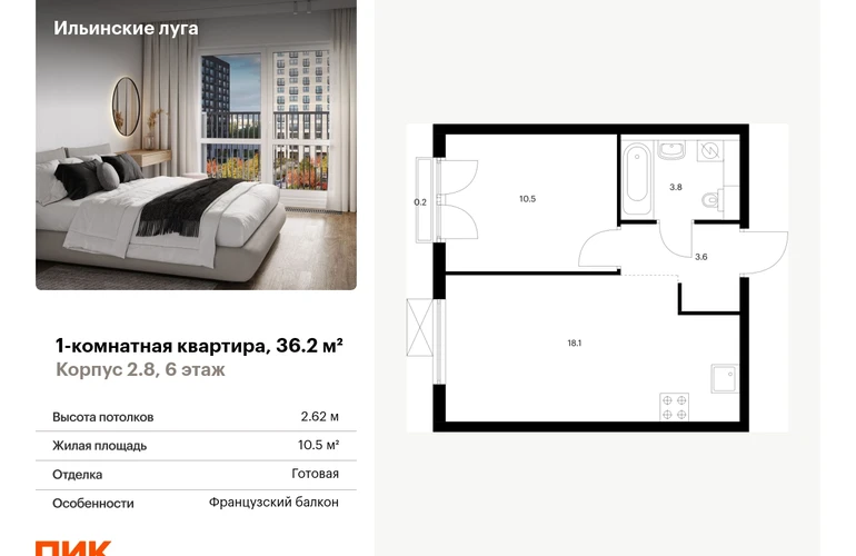 Продаётся 1-комн.квартира площадью 36.20 кв.м на 6 этаже 9 этажного дома (Корпус 2.8, секция 4) проекта ПИК Ильинские луга. Светлый просторный подъезд на уровне земли, функциональная планировка, большие окна, с отделкой. Жилой район «Ильинские луга» находится в 10 километрах от МКАД по Новорижскому шоссе, в 20 минутах на автомобиле от станций метро «Волоколамская», «Тушинская» и «Строгино». В будущем ближе к проекту, в 9 минутах пути на машине, откроется станция «Ильинская» Рублёво-Архангельской линии, которая будет соединять Арбатско-Покровскую линию и Большую кольцевую линию. «Ильинские луга» — масштабный проект, в который входит девять детских садов, четыре школы и поликлиника. Он строится в престижном и экологичном районе среди лесов и памятников природы. За 5 минут от жилого квартала можно доехать до Рублёво-Успенского шоссе, а за 30 минут — до центра Москвы. До крупного торгового центра «РИГАМОЛЛ» всего 5 минут на автомобиле, а до ТЦ «Твой дом» и гипермаркета «Глобус» — 10 минут. В «Ильинских лугах» строятся только девятиэтажные дома — такая архитектура соответствует спокойной жизни за городом. В каждом дворе-парке есть места для отдыха, детские и спортивные площадки. А ещё, здесь уже открыт большой PlayHub «Гравити» — современное игровое пространство с космической тематикой, холмами, зонами для игр и отдыха жителей любого возраста. На первых этажах уже работают магазины, кафе и пекарни. Места для отдыха от «Ильинских лугов» тоже недалеко: 10 минут на машине — и вы в музее-усадьбе «Архангельское». Также рядом находится Лохин остров — памятник природы, где водятся речные черепахи, есть места для кемпинга и возможность сплавиться по реке. Артикул - 942844О застройщике