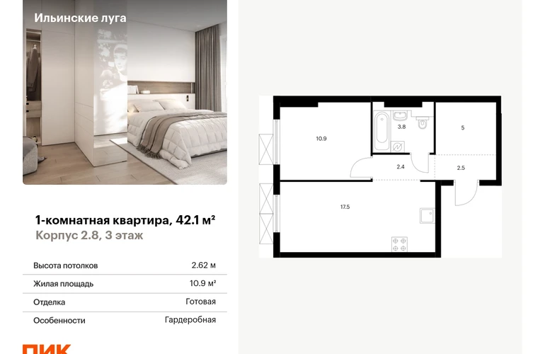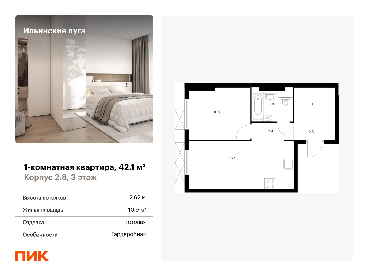 Продаётся 1-комн.квартира площадью 42.10 кв.м на 3 этаже 9 этажного дома (Корпус 2.8, секция 2) проекта ПИК Ильинские луга. Светлый просторный подъезд на уровне земли, функциональная планировка, большие окна, с отделкой. <br> <br>Жилой район «Ильинские луга» находится в 10 километрах от МКАД по Новорижскому шоссе, в 20 минутах на автомобиле от станций метро «Волоколамская», «Тушинская» и «Строгино». В будущем ближе к проекту, в 9 минутах пути на машине, откроется станция «Ильинская» Рублёво-Архангельской линии, которая будет соединять Арбатско-Покровскую линию и Большую кольцевую линию. <br> <br>«Ильинские луга» — масштабный проект, в который входит девять детских садов, четыре школы и поликлиника. Он строится в престижном и экологичном районе среди лесов и памятников природы. За 5 минут от жилого квартала можно доехать до Рублёво-Успенского шоссе, а за 30 минут — до центра Москвы. До крупного торгового центра «РИГАМОЛЛ» всего 5 минут на автомобиле, а до ТЦ «Твой дом» и гипермаркета «Глобус» — 10 минут. <br> <br>В «Ильинских лугах» строятся только девятиэтажные дома — такая архитектура соответствует спокойной жизни за городом. В каждом дворе-парке есть места для отдыха, детские и спортивные площадки. А ещё, здесь уже открыт большой PlayHub «Гравити» — современное игровое пространство с космической тематикой, холмами, зонами для игр и отдыха жителей любого возраста. <br> <br>На первых этажах уже работают магазины, кафе и пекарни. <br> <br>Места для отдыха от «Ильинских лугов» тоже недалеко: 10 минут на машине — и вы в музее-усадьбе «Архангельское». Также рядом находится Лохин остров — памятник природы, где водятся речные черепахи, есть места для кемпинга и возможность сплавиться по реке. Артикул - 942626О застройщике