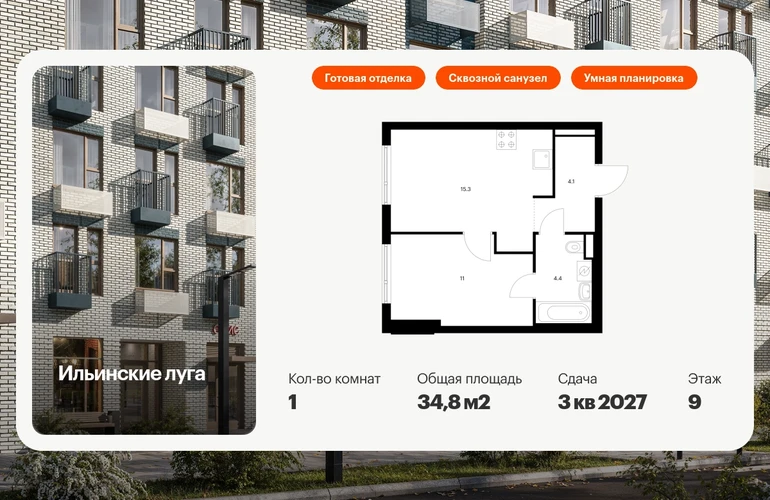 Продаётся 1-комн.квартира площадью 34.80 кв.м на 9 этаже 9 этажного дома (Корпус 3.3, секция 5) проекта ПИК Ильинские луга. Светлый просторный подъезд на уровне земли, функциональная планировка, большие окна, с отделкой. Жилой район «Ильинские луга» находится в 10 километрах от МКАД по Новорижскому шоссе, в 20 минутах на автомобиле от станций метро «Волоколамская», «Тушинская» и «Строгино». В будущем ближе к проекту, в 9 минутах пути на машине, откроется станция «Ильинская» Рублёво-Архангельской линии, которая будет соединять Арбатско-Покровскую линию и Большую кольцевую линию. «Ильинские луга» — масштабный проект, в который входит девять детских садов, четыре школы и поликлиника. Он строится в престижном и экологичном районе среди лесов и памятников природы. За 5 минут от жилого квартала можно доехать до Рублёво-Успенского шоссе, а за 30 минут — до центра Москвы. До крупного торгового центра «РИГАМОЛЛ» всего 5 минут на автомобиле, а до ТЦ «Твой дом» и гипермаркета «Глобус» — 10 минут. В «Ильинских лугах» строятся только девятиэтажные дома — такая архитектура соответствует спокойной жизни за городом. В каждом дворе-парке есть места для отдыха, детские и спортивные площадки. А ещё, здесь уже открыт большой PlayHub «Гравити» — современное игровое пространство с космической тематикой, холмами, зонами для игр и отдыха жителей любого возраста. На первых этажах уже работают магазины, кафе и пекарни. Места для отдыха от «Ильинских лугов» тоже недалеко: 10 минут на машине — и вы в музее-усадьбе «Архангельское». Также рядом находится Лохин остров — памятник природы, где водятся речные черепахи, есть места для кемпинга и возможность сплавиться по реке. Артикул - 994208О застройщике
