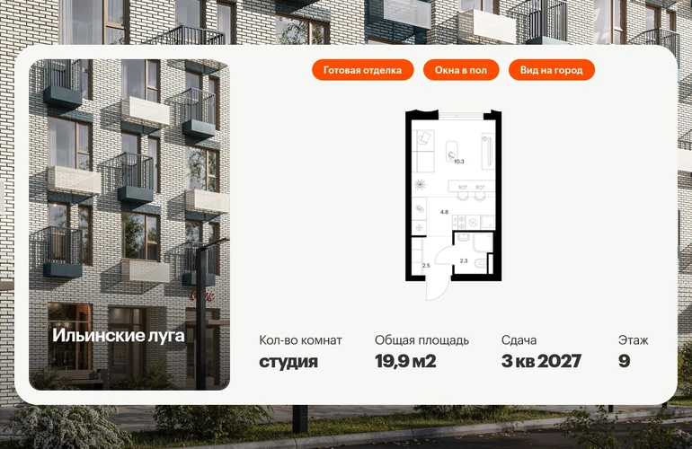 Продаётся квартира-студия площадью 19.90 кв.м на 9 этаже 9 этажного дома (Корпус 3.5, секция 2) проекта ПИК Ильинские луга. Светлый просторный подъезд на уровне земли, функциональная планировка, большие окна, с отделкой. Артикул - 1001676О застройщике