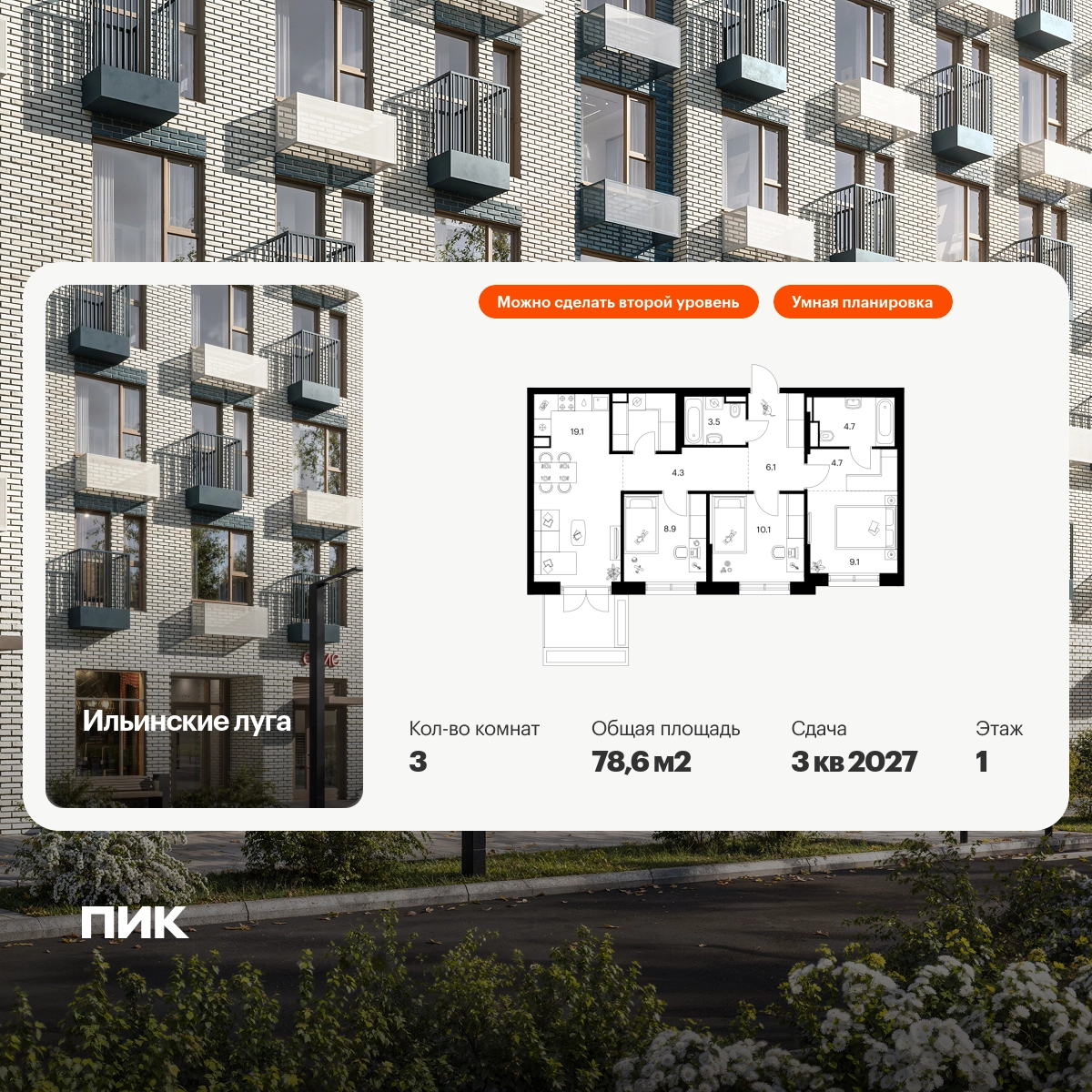 Продаётся 3-комн.квартира площадью 78.60 кв.м на 1 этаже 9 этажного дома (Корпус 4.3, секция 2) проекта ПИК Ильинские луга. Светлый просторный подъезд на уровне земли, функциональная планировка, большие окна, с отделкой. Жилой район «Ильинские луга» находится в 10 километрах от МКАД по Новорижскому шоссе, в 20 минутах на автомобиле от станций метро «Волоколамская», «Тушинская» и «Строгино». В будущем ближе к проекту, в 9 минутах пути на машине, откроется станция «Ильинская» Рублёво-Архангельской линии, которая будет соединять Арбатско-Покровскую линию и Большую кольцевую линию. «Ильинские луга» — масштабный проект, в который входит девять детских садов, четыре школы и поликлиника. Он строится в престижном и экологичном районе среди лесов и памятников природы. За 5 минут от жилого квартала можно доехать до Рублёво-Успенского шоссе, а за 30 минут — до центра Москвы. До крупного торгового центра «РИГАМОЛЛ» всего 5 минут на автомобиле, а до ТЦ «Твой дом» и гипермаркета «Глобус» — 10 минут. В «Ильинских лугах» строятся только девятиэтажные дома — такая архитектура соответствует спокойной жизни за городом. В каждом дворе-парке есть места для отдыха, детские и спортивные площадки. А ещё, здесь уже открыт большой PlayHub «Гравити» — современное игровое пространство с космической тематикой, холмами, зонами для игр и отдыха жителей любого возраста. На первых этажах уже работают магазины, кафе и пекарни. Места для отдыха от «Ильинских лугов» тоже недалеко: 10 минут на машине — и вы в музее-усадьбе «Архангельское». Также рядом находится Лохин остров — памятник природы, где водятся речные черепахи, есть места для кемпинга и возможность сплавиться по реке. Артикул - 1011857О застройщике