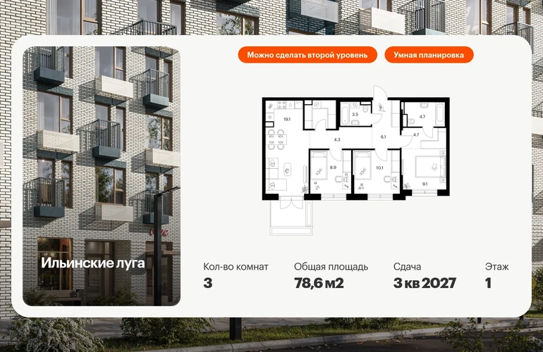 Продаётся 3-комн.квартира площадью 78.60 кв.м на 1 этаже 9 этажного дома (Корпус 4.3, секция 2) проекта ПИК Ильинские луга. Светлый просторный подъезд на уровне земли, функциональная планировка, большие окна, с отделкой. Жилой район «Ильинские луга» находится в 10 километрах от МКАД по Новорижскому шоссе, в 20 минутах на автомобиле от станций метро «Волоколамская», «Тушинская» и «Строгино». В будущем ближе к проекту, в 9 минутах пути на машине, откроется станция «Ильинская» Рублёво-Архангельской линии, которая будет соединять Арбатско-Покровскую линию и Большую кольцевую линию. «Ильинские луга» — масштабный проект, в который входит девять детских садов, четыре школы и поликлиника. Он строится в престижном и экологичном районе среди лесов и памятников природы. За 5 минут от жилого квартала можно доехать до Рублёво-Успенского шоссе, а за 30 минут — до центра Москвы. До крупного торгового центра «РИГАМОЛЛ» всего 5 минут на автомобиле, а до ТЦ «Твой дом» и гипермаркета «Глобус» — 10 минут. В «Ильинских лугах» строятся только девятиэтажные дома — такая архитектура соответствует спокойной жизни за городом. В каждом дворе-парке есть места для отдыха, детские и спортивные площадки. А ещё, здесь уже открыт большой PlayHub «Гравити» — современное игровое пространство с космической тематикой, холмами, зонами для игр и отдыха жителей любого возраста. На первых этажах уже работают магазины, кафе и пекарни. Места для отдыха от «Ильинских лугов» тоже недалеко: 10 минут на машине — и вы в музее-усадьбе «Архангельское». Также рядом находится Лохин остров — памятник природы, где водятся речные черепахи, есть места для кемпинга и возможность сплавиться по реке. Артикул - 1011857О застройщике