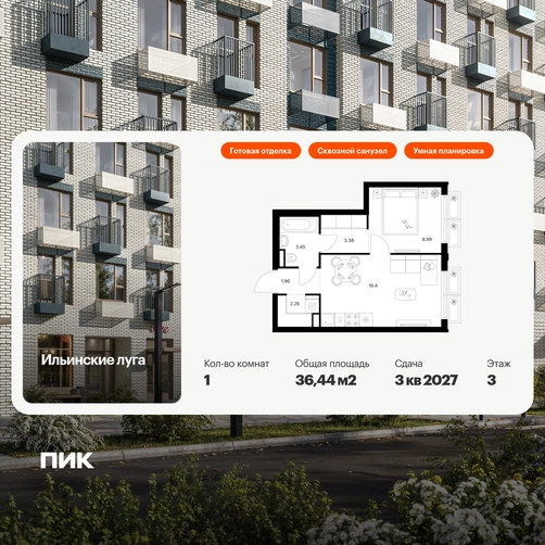 Продаётся 1-комн.квартира площадью 36.44 кв.м на 3 этаже 9 этажного дома (Корпус 4.2, секция 2) проекта ПИК Ильинские луга. Светлый просторный подъезд на уровне земли, функциональная планировка, большие окна, с отделкой. Жилой район «Ильинские луга» находится в 10 километрах от МКАД по Новорижскому шоссе, в 20 минутах на автомобиле от станций метро «Волоколамская», «Тушинская» и «Строгино». В будущем ближе к проекту, в 9 минутах пути на машине, откроется станция «Ильинская» Рублёво-Архангельской линии, которая будет соединять Арбатско-Покровскую линию и Большую кольцевую линию. «Ильинские луга» — масштабный проект, в который входит девять детских садов, четыре школы и поликлиника. Он строится в престижном и экологичном районе среди лесов и памятников природы. За 5 минут от жилого квартала можно доехать до Рублёво-Успенского шоссе, а за 30 минут — до центра Москвы. До крупного торгового центра «РИГАМОЛЛ» всего 5 минут на автомобиле, а до ТЦ «Твой дом» и гипермаркета «Глобус» — 10 минут. В «Ильинских лугах» строятся только девятиэтажные дома — такая архитектура соответствует спокойной жизни за городом. В каждом дворе-парке есть места для отдыха, детские и спортивные площадки. А ещё, здесь уже открыт большой PlayHub «Гравити» — современное игровое пространство с космической тематикой, холмами, зонами для игр и отдыха жителей любого возраста. На первых этажах уже работают магазины, кафе и пекарни. Места для отдыха от «Ильинских лугов» тоже недалеко: 10 минут на машине — и вы в музее-усадьбе «Архангельское». Также рядом находится Лохин остров — памятник природы, где водятся речные черепахи, есть места для кемпинга и возможность сплавиться по реке. Артикул - 1015416О застройщике