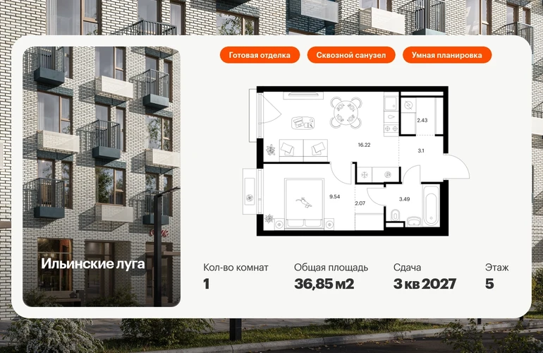 Продаётся 1-комн.квартира площадью 36.85 кв.м на 5 этаже 9 этажного дома (Корпус 4.1, секция 2) проекта ПИК Ильинские луга. Светлый просторный подъезд на уровне земли, функциональная планировка, большие окна, с отделкой. Жилой район «Ильинские луга» находится в 10 километрах от МКАД по Новорижскому шоссе, в 20 минутах на автомобиле от станций метро «Волоколамская», «Тушинская» и «Строгино». В будущем ближе к проекту, в 9 минутах пути на машине, откроется станция «Ильинская» Рублёво-Архангельской линии, которая будет соединять Арбатско-Покровскую линию и Большую кольцевую линию. «Ильинские луга» — масштабный проект, в который входит девять детских садов, четыре школы и поликлиника. Он строится в престижном и экологичном районе среди лесов и памятников природы. За 5 минут от жилого квартала можно доехать до Рублёво-Успенского шоссе, а за 30 минут — до центра Москвы. До крупного торгового центра «РИГАМОЛЛ» всего 5 минут на автомобиле, а до ТЦ «Твой дом» и гипермаркета «Глобус» — 10 минут. В «Ильинских лугах» строятся только девятиэтажные дома — такая архитектура соответствует спокойной жизни за городом. В каждом дворе-парке есть места для отдыха, детские и спортивные площадки. А ещё, здесь уже открыт большой PlayHub «Гравити» — современное игровое пространство с космической тематикой, холмами, зонами для игр и отдыха жителей любого возраста. На первых этажах уже работают магазины, кафе и пекарни. Места для отдыха от «Ильинских лугов» тоже недалеко: 10 минут на машине — и вы в музее-усадьбе «Архангельское». Также рядом находится Лохин остров — памятник природы, где водятся речные черепахи, есть места для кемпинга и возможность сплавиться по реке. Артикул - 1015846О застройщике