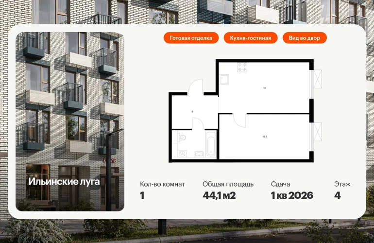 Продаётся 1-комн.квартира площадью 44.10 кв.м на 4 этаже 9 этажного дома (Корпус 2.13, секция 1) проекта ПИК Ильинские луга. Светлый просторный подъезд на уровне земли, функциональная планировка, большие окна, с отделкой. Жилой район «Ильинские луга» находится в 10 километрах от МКАД по Новорижскому шоссе, в 20 минутах на автомобиле от станций метро «Волоколамская», «Тушинская» и «Строгино». В будущем ближе к проекту, в 9 минутах пути на машине, откроется станция «Ильинская» Рублёво-Архангельской линии, которая будет соединять Арбатско-Покровскую линию и Большую кольцевую линию. «Ильинские луга» — масштабный проект, в который входит девять детских садов, четыре школы и поликлиника. Он строится в престижном и экологичном районе среди лесов и памятников природы. За 5 минут от жилого квартала можно доехать до Рублёво-Успенского шоссе, а за 30 минут — до центра Москвы. До крупного торгового центра «РИГАМОЛЛ» всего 5 минут на автомобиле, а до ТЦ «Твой дом» и гипермаркета «Глобус» — 10 минут. В «Ильинских лугах» строятся только девятиэтажные дома — такая архитектура соответствует спокойной жизни за городом. В каждом дворе-парке есть места для отдыха, детские и спортивные площадки. А ещё, здесь уже открыт большой PlayHub «Гравити» — современное игровое пространство с космической тематикой, холмами, зонами для игр и отдыха жителей любого возраста. На первых этажах уже работают магазины, кафе и пекарни. Места для отдыха от «Ильинских лугов» тоже недалеко: 10 минут на машине — и вы в музее-усадьбе «Архангельское». Также рядом находится Лохин остров — памятник природы, где водятся речные черепахи, есть места для кемпинга и возможность сплавиться по реке. Артикул - 927483О застройщике