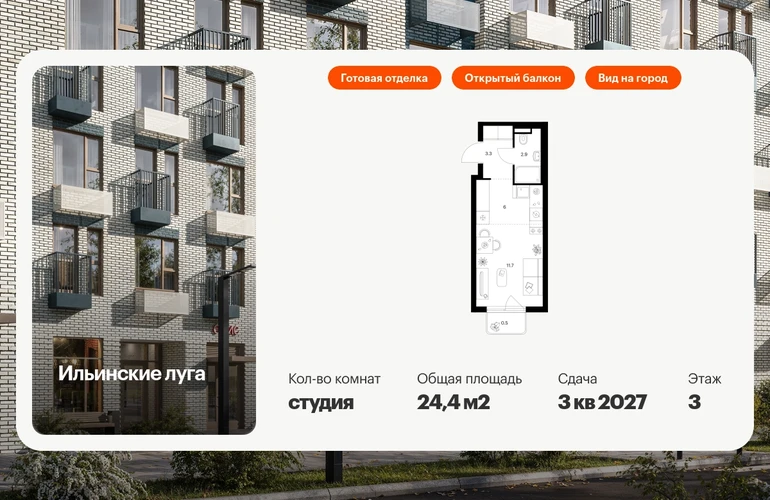 Продаётся квартира-студия площадью 24.40 кв.м на 3 этаже 9 этажного дома (Корпус 3.5, секция 2) проекта ПИК Ильинские луга. Светлый просторный подъезд на уровне земли, функциональная планировка, большие окна, с отделкой. Артикул - 1001524О застройщике
