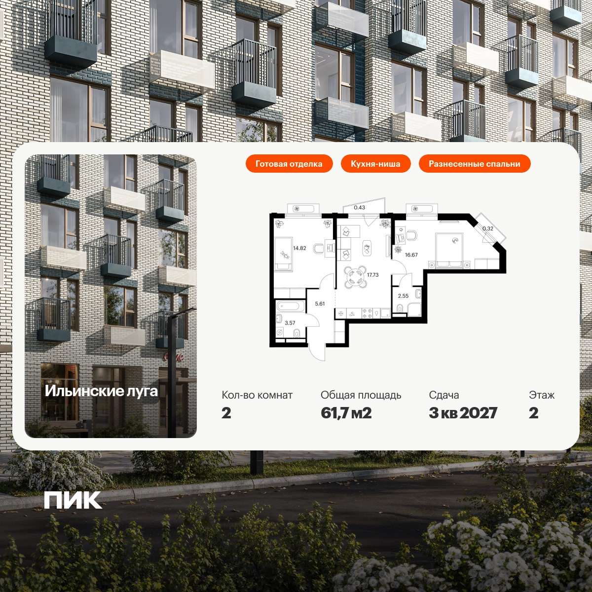 Продаётся 2-комн.квартира площадью 61.70 кв.м на 2 этаже 9 этажного дома (Корпус 4.2, секция 2) проекта ПИК Ильинские луга. Светлый просторный подъезд на уровне земли, функциональная планировка, большие окна, с отделкой. Жилой район «Ильинские луга» находится в 10 километрах от МКАД по Новорижскому шоссе, в 20 минутах на автомобиле от станций метро «Волоколамская», «Тушинская» и «Строгино». В будущем ближе к проекту, в 9 минутах пути на машине, откроется станция «Ильинская» Рублёво-Архангельской линии, которая будет соединять Арбатско-Покровскую линию и Большую кольцевую линию. «Ильинские луга» — масштабный проект, в который входит девять детских садов, четыре школы и поликлиника. Он строится в престижном и экологичном районе среди лесов и памятников природы. За 5 минут от жилого квартала можно доехать до Рублёво-Успенского шоссе, а за 30 минут — до центра Москвы. До крупного торгового центра «РИГАМОЛЛ» всего 5 минут на автомобиле, а до ТЦ «Твой дом» и гипермаркета «Глобус» — 10 минут. В «Ильинских лугах» строятся только девятиэтажные дома — такая архитектура соответствует спокойной жизни за городом. В каждом дворе-парке есть места для отдыха, детские и спортивные площадки. А ещё, здесь уже открыт большой PlayHub «Гравити» — современное игровое пространство с космической тематикой, холмами, зонами для игр и отдыха жителей любого возраста. На первых этажах уже работают магазины, кафе и пекарни. Места для отдыха от «Ильинских лугов» тоже недалеко: 10 минут на машине — и вы в музее-усадьбе «Архангельское». Также рядом находится Лохин остров — памятник природы, где водятся речные черепахи, есть места для кемпинга и возможность сплавиться по реке. Артикул - 1015403О застройщике
