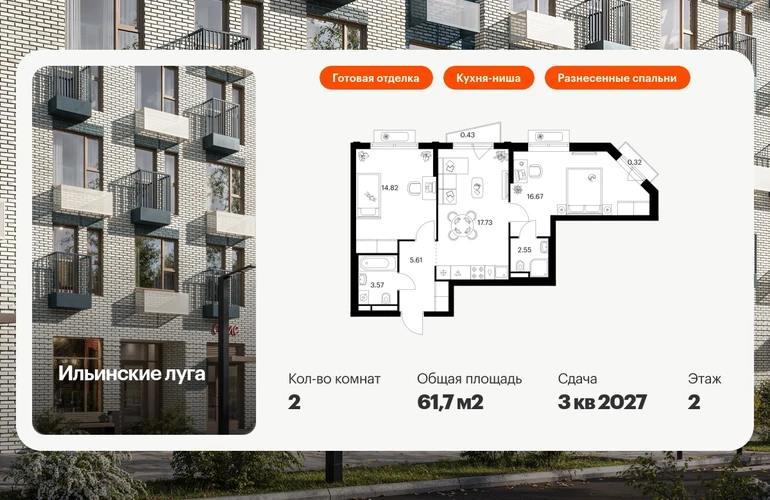 Продаётся 2-комн.квартира площадью 61.70 кв.м на 2 этаже 9 этажного дома (Корпус 4.2, секция 2) проекта ПИК Ильинские луга. Светлый просторный подъезд на уровне земли, функциональная планировка, большие окна, с отделкой. Жилой район «Ильинские луга» находится в 10 километрах от МКАД по Новорижскому шоссе, в 20 минутах на автомобиле от станций метро «Волоколамская», «Тушинская» и «Строгино». В будущем ближе к проекту, в 9 минутах пути на машине, откроется станция «Ильинская» Рублёво-Архангельской линии, которая будет соединять Арбатско-Покровскую линию и Большую кольцевую линию. «Ильинские луга» — масштабный проект, в который входит девять детских садов, четыре школы и поликлиника. Он строится в престижном и экологичном районе среди лесов и памятников природы. За 5 минут от жилого квартала можно доехать до Рублёво-Успенского шоссе, а за 30 минут — до центра Москвы. До крупного торгового центра «РИГАМОЛЛ» всего 5 минут на автомобиле, а до ТЦ «Твой дом» и гипермаркета «Глобус» — 10 минут. В «Ильинских лугах» строятся только девятиэтажные дома — такая архитектура соответствует спокойной жизни за городом. В каждом дворе-парке есть места для отдыха, детские и спортивные площадки. А ещё, здесь уже открыт большой PlayHub «Гравити» — современное игровое пространство с космической тематикой, холмами, зонами для игр и отдыха жителей любого возраста. На первых этажах уже работают магазины, кафе и пекарни. Места для отдыха от «Ильинских лугов» тоже недалеко: 10 минут на машине — и вы в музее-усадьбе «Архангельское». Также рядом находится Лохин остров — памятник природы, где водятся речные черепахи, есть места для кемпинга и возможность сплавиться по реке. Артикул - 1015403О застройщике