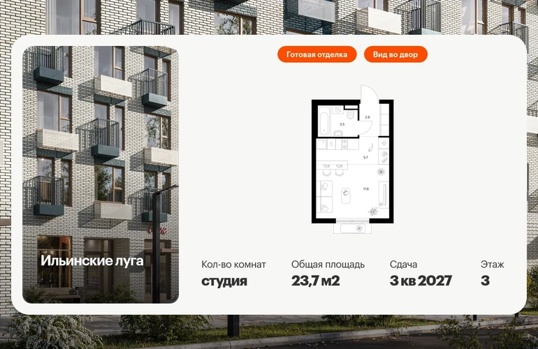 Продаётся квартира-студия площадью 23.70 кв.м на 3 этаже 9 этажного дома (Корпус 3.1, секция 2) проекта ПИК Ильинские луга. Светлый просторный подъезд на уровне земли, функциональная планировка, большие окна, с отделкой. Жилой район «Ильинские луга» находится в 10 километрах от МКАД по Новорижскому шоссе, в 20 минутах на автомобиле от станций метро «Волоколамская», «Тушинская» и «Строгино». В будущем ближе к проекту, в 9 минутах пути на машине, откроется станция «Ильинская» Рублёво-Архангельской линии, которая будет соединять Арбатско-Покровскую линию и Большую кольцевую линию. «Ильинские луга» — масштабный проект, в который входит девять детских садов, четыре школы и поликлиника. Он строится в престижном и экологичном районе среди лесов и памятников природы. За 5 минут от жилого квартала можно доехать до Рублёво-Успенского шоссе, а за 30 минут — до центра Москвы. До крупного торгового центра «РИГАМОЛЛ» всего 5 минут на автомобиле, а до ТЦ «Твой дом» и гипермаркета «Глобус» — 10 минут. В «Ильинских лугах» строятся только девятиэтажные дома — такая архитектура соответствует спокойной жизни за городом. В каждом дворе-парке есть места для отдыха, детские и спортивные площадки. А ещё, здесь уже открыт большой PlayHub «Гравити» — современное игровое пространство с космической тематикой, холмами, зонами для игр и отдыха жителей любого возраста. На первых этажах уже работают магазины, кафе и пекарни. Места для отдыха от «Ильинских лугов» тоже недалеко: 10 минут на машине — и вы в музее-усадьбе «Архангельское». Также рядом находится Лохин остров — памятник природы, где водятся речные черепахи, есть места для кемпинга и возможность сплавиться по реке. Артикул - 1001422О застройщике