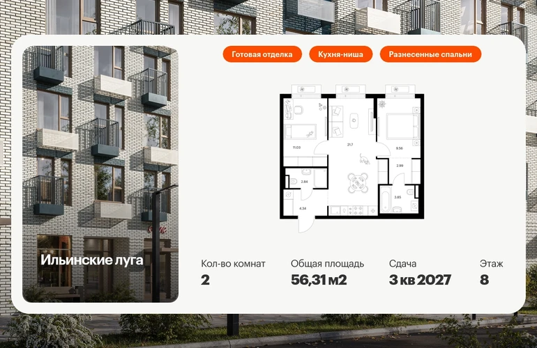 Продаётся 2-комн.квартира площадью 56.31 кв.м на 8 этаже 9 этажного дома (Корпус 4.1, секция 3) проекта ПИК Ильинские луга. Светлый просторный подъезд на уровне земли, функциональная планировка, большие окна, с отделкой. Жилой район «Ильинские луга» находится в 10 километрах от МКАД по Новорижскому шоссе, в 20 минутах на автомобиле от станций метро «Волоколамская», «Тушинская» и «Строгино». В будущем ближе к проекту, в 9 минутах пути на машине, откроется станция «Ильинская» Рублёво-Архангельской линии, которая будет соединять Арбатско-Покровскую линию и Большую кольцевую линию. «Ильинские луга» — масштабный проект, в который входит девять детских садов, четыре школы и поликлиника. Он строится в престижном и экологичном районе среди лесов и памятников природы. За 5 минут от жилого квартала можно доехать до Рублёво-Успенского шоссе, а за 30 минут — до центра Москвы. До крупного торгового центра «РИГАМОЛЛ» всего 5 минут на автомобиле, а до ТЦ «Твой дом» и гипермаркета «Глобус» — 10 минут. В «Ильинских лугах» строятся только девятиэтажные дома — такая архитектура соответствует спокойной жизни за городом. В каждом дворе-парке есть места для отдыха, детские и спортивные площадки. А ещё, здесь уже открыт большой PlayHub «Гравити» — современное игровое пространство с космической тематикой, холмами, зонами для игр и отдыха жителей любого возраста. На первых этажах уже работают магазины, кафе и пекарни. Места для отдыха от «Ильинских лугов» тоже недалеко: 10 минут на машине — и вы в музее-усадьбе «Архангельское». Также рядом находится Лохин остров — памятник природы, где водятся речные черепахи, есть места для кемпинга и возможность сплавиться по реке. Артикул - 1016000О застройщике