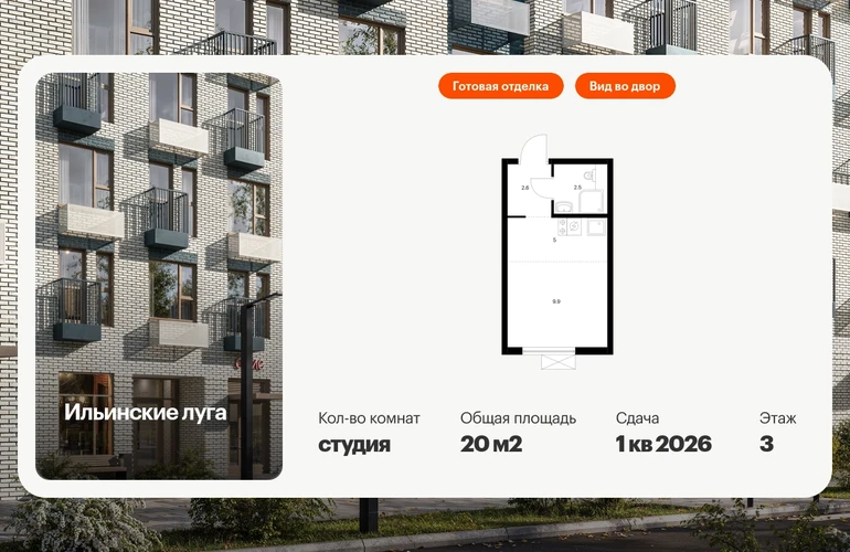 Продаётся квартира-студия площадью 20.00 кв.м на 3 этаже 9 этажного дома (Корпус 2.13, секция 1) проекта ПИК Ильинские луга. Светлый просторный подъезд на уровне земли, функциональная планировка, большие окна, с отделкой. Жилой район «Ильинские луга» находится в 10 километрах от МКАД по Новорижскому шоссе, в 20 минутах на автомобиле от станций метро «Волоколамская», «Тушинская» и «Строгино». В будущем ближе к проекту, в 9 минутах пути на машине, откроется станция «Ильинская» Рублёво-Архангельской линии, которая будет соединять Арбатско-Покровскую линию и Большую кольцевую линию. «Ильинские луга» — масштабный проект, в который входит девять детских садов, четыре школы и поликлиника. Он строится в престижном и экологичном районе среди лесов и памятников природы. За 5 минут от жилого квартала можно доехать до Рублёво-Успенского шоссе, а за 30 минут — до центра Москвы. До крупного торгового центра «РИГАМОЛЛ» всего 5 минут на автомобиле, а до ТЦ «Твой дом» и гипермаркета «Глобус» — 10 минут. В «Ильинских лугах» строятся только девятиэтажные дома — такая архитектура соответствует спокойной жизни за городом. В каждом дворе-парке есть места для отдыха, детские и спортивные площадки. А ещё, здесь уже открыт большой PlayHub «Гравити» — современное игровое пространство с космической тематикой, холмами, зонами для игр и отдыха жителей любого возраста. На первых этажах уже работают магазины, кафе и пекарни. Места для отдыха от «Ильинских лугов» тоже недалеко: 10 минут на машине — и вы в музее-усадьбе «Архангельское». Также рядом находится Лохин остров — памятник природы, где водятся речные черепахи, есть места для кемпинга и возможность сплавиться по реке. Артикул - 927460О застройщике