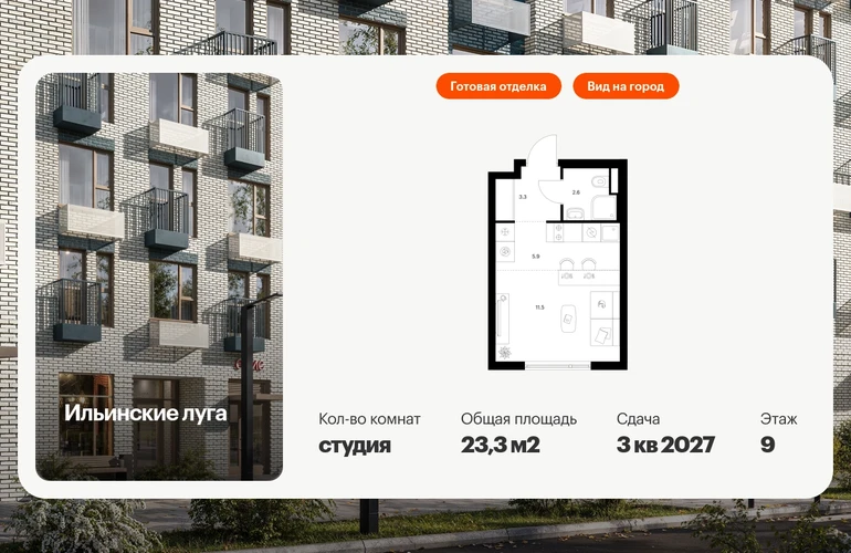 Продаётся квартира-студия площадью 23.30 кв.м на 9 этаже 9 этажного дома (Корпус 3.3, секция 5) проекта ПИК Ильинские луга. Светлый просторный подъезд на уровне земли, функциональная планировка, большие окна, с отделкой. Жилой район «Ильинские луга» находится в 10 километрах от МКАД по Новорижскому шоссе, в 20 минутах на автомобиле от станций метро «Волоколамская», «Тушинская» и «Строгино». В будущем ближе к проекту, в 9 минутах пути на машине, откроется станция «Ильинская» Рублёво-Архангельской линии, которая будет соединять Арбатско-Покровскую линию и Большую кольцевую линию. «Ильинские луга» — масштабный проект, в который входит девять детских садов, четыре школы и поликлиника. Он строится в престижном и экологичном районе среди лесов и памятников природы. За 5 минут от жилого квартала можно доехать до Рублёво-Успенского шоссе, а за 30 минут — до центра Москвы. До крупного торгового центра «РИГАМОЛЛ» всего 5 минут на автомобиле, а до ТЦ «Твой дом» и гипермаркета «Глобус» — 10 минут. В «Ильинских лугах» строятся только девятиэтажные дома — такая архитектура соответствует спокойной жизни за городом. В каждом дворе-парке есть места для отдыха, детские и спортивные площадки. А ещё, здесь уже открыт большой PlayHub «Гравити» — современное игровое пространство с космической тематикой, холмами, зонами для игр и отдыха жителей любого возраста. На первых этажах уже работают магазины, кафе и пекарни. Места для отдыха от «Ильинских лугов» тоже недалеко: 10 минут на машине — и вы в музее-усадьбе «Архангельское». Также рядом находится Лохин остров — памятник природы, где водятся речные черепахи, есть места для кемпинга и возможность сплавиться по реке. Артикул - 993866О застройщике