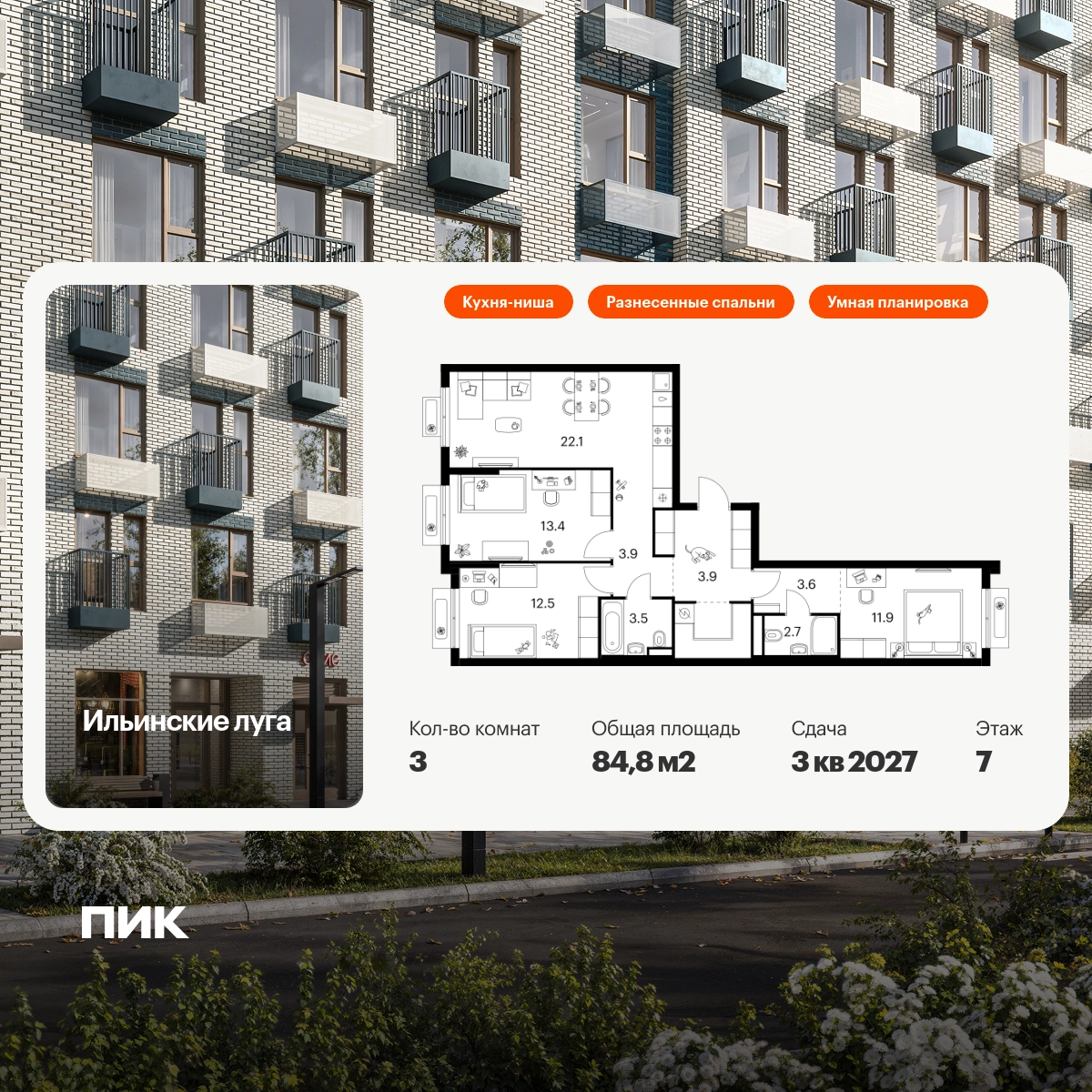 Продаётся 3-комн.квартира площадью 84.80 кв.м на 7 этаже 9 этажного дома (Корпус 4.3, секция 1) проекта ПИК Ильинские луга. Светлый просторный подъезд на уровне земли, функциональная планировка, большие окна, с отделкой. Жилой район «Ильинские луга» находится в 10 километрах от МКАД по Новорижскому шоссе, в 20 минутах на автомобиле от станций метро «Волоколамская», «Тушинская» и «Строгино». В будущем ближе к проекту, в 9 минутах пути на машине, откроется станция «Ильинская» Рублёво-Архангельской линии, которая будет соединять Арбатско-Покровскую линию и Большую кольцевую линию. «Ильинские луга» — масштабный проект, в который входит девять детских садов, четыре школы и поликлиника. Он строится в престижном и экологичном районе среди лесов и памятников природы. За 5 минут от жилого квартала можно доехать до Рублёво-Успенского шоссе, а за 30 минут — до центра Москвы. До крупного торгового центра «РИГАМОЛЛ» всего 5 минут на автомобиле, а до ТЦ «Твой дом» и гипермаркета «Глобус» — 10 минут. В «Ильинских лугах» строятся только девятиэтажные дома — такая архитектура соответствует спокойной жизни за городом. В каждом дворе-парке есть места для отдыха, детские и спортивные площадки. А ещё, здесь уже открыт большой PlayHub «Гравити» — современное игровое пространство с космической тематикой, холмами, зонами для игр и отдыха жителей любого возраста. На первых этажах уже работают магазины, кафе и пекарни. Места для отдыха от «Ильинских лугов» тоже недалеко: 10 минут на машине — и вы в музее-усадьбе «Архангельское». Также рядом находится Лохин остров — памятник природы, где водятся речные черепахи, есть места для кемпинга и возможность сплавиться по реке. Артикул - 1011827О застройщике