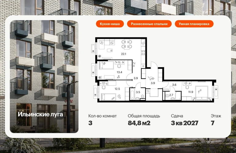 Продаётся 3-комн.квартира площадью 84.80 кв.м на 7 этаже 9 этажного дома (Корпус 4.3, секция 1) проекта ПИК Ильинские луга. Светлый просторный подъезд на уровне земли, функциональная планировка, большие окна, с отделкой. Жилой район «Ильинские луга» находится в 10 километрах от МКАД по Новорижскому шоссе, в 20 минутах на автомобиле от станций метро «Волоколамская», «Тушинская» и «Строгино». В будущем ближе к проекту, в 9 минутах пути на машине, откроется станция «Ильинская» Рублёво-Архангельской линии, которая будет соединять Арбатско-Покровскую линию и Большую кольцевую линию. «Ильинские луга» — масштабный проект, в который входит девять детских садов, четыре школы и поликлиника. Он строится в престижном и экологичном районе среди лесов и памятников природы. За 5 минут от жилого квартала можно доехать до Рублёво-Успенского шоссе, а за 30 минут — до центра Москвы. До крупного торгового центра «РИГАМОЛЛ» всего 5 минут на автомобиле, а до ТЦ «Твой дом» и гипермаркета «Глобус» — 10 минут. В «Ильинских лугах» строятся только девятиэтажные дома — такая архитектура соответствует спокойной жизни за городом. В каждом дворе-парке есть места для отдыха, детские и спортивные площадки. А ещё, здесь уже открыт большой PlayHub «Гравити» — современное игровое пространство с космической тематикой, холмами, зонами для игр и отдыха жителей любого возраста. На первых этажах уже работают магазины, кафе и пекарни. Места для отдыха от «Ильинских лугов» тоже недалеко: 10 минут на машине — и вы в музее-усадьбе «Архангельское». Также рядом находится Лохин остров — памятник природы, где водятся речные черепахи, есть места для кемпинга и возможность сплавиться по реке. Артикул - 1011827О застройщике