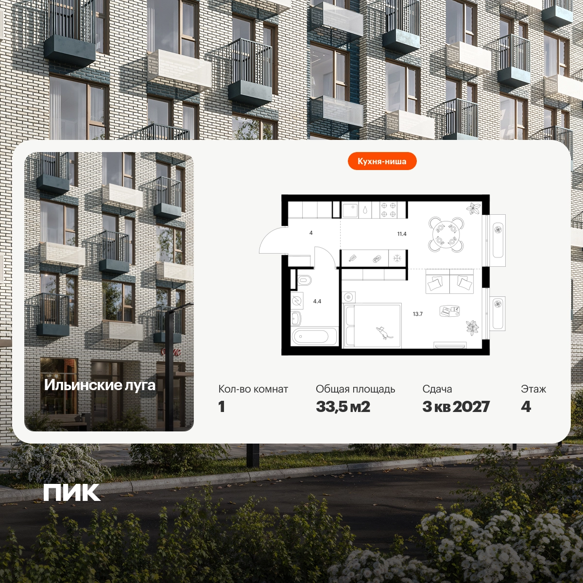 Продаётся 1-комн.квартира площадью 33.50 кв.м на 4 этаже 9 этажного дома (Корпус 4.3, секция 5) проекта ПИК Ильинские луга. Светлый просторный подъезд на уровне земли, функциональная планировка, большие окна, с отделкой. Жилой район «Ильинские луга» находится в 10 километрах от МКАД по Новорижскому шоссе, в 20 минутах на автомобиле от станций метро «Волоколамская», «Тушинская» и «Строгино». В будущем ближе к проекту, в 9 минутах пути на машине, откроется станция «Ильинская» Рублёво-Архангельской линии, которая будет соединять Арбатско-Покровскую линию и Большую кольцевую линию. «Ильинские луга» — масштабный проект, в который входит девять детских садов, четыре школы и поликлиника. Он строится в престижном и экологичном районе среди лесов и памятников природы. За 5 минут от жилого квартала можно доехать до Рублёво-Успенского шоссе, а за 30 минут — до центра Москвы. До крупного торгового центра «РИГАМОЛЛ» всего 5 минут на автомобиле, а до ТЦ «Твой дом» и гипермаркета «Глобус» — 10 минут. В «Ильинских лугах» строятся только девятиэтажные дома — такая архитектура соответствует спокойной жизни за городом. В каждом дворе-парке есть места для отдыха, детские и спортивные площадки. А ещё, здесь уже открыт большой PlayHub «Гравити» — современное игровое пространство с космической тематикой, холмами, зонами для игр и отдыха жителей любого возраста. На первых этажах уже работают магазины, кафе и пекарни. Места для отдыха от «Ильинских лугов» тоже недалеко: 10 минут на машине — и вы в музее-усадьбе «Архангельское». Также рядом находится Лохин остров — памятник природы, где водятся речные черепахи, есть места для кемпинга и возможность сплавиться по реке. Артикул - 1012238О застройщике