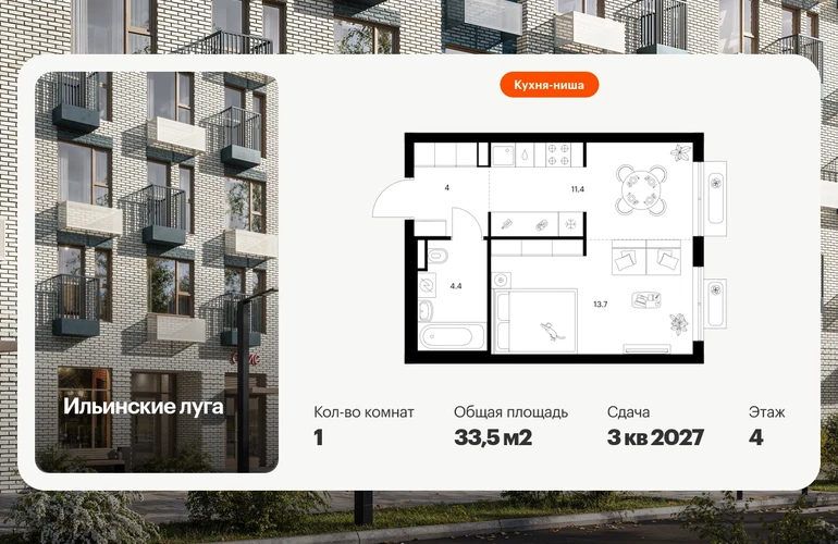 Продаётся 1-комн.квартира площадью 33.50 кв.м на 4 этаже 9 этажного дома (Корпус 4.3, секция 5) проекта ПИК Ильинские луга. Светлый просторный подъезд на уровне земли, функциональная планировка, большие окна, с отделкой. Жилой район «Ильинские луга» находится в 10 километрах от МКАД по Новорижскому шоссе, в 20 минутах на автомобиле от станций метро «Волоколамская», «Тушинская» и «Строгино». В будущем ближе к проекту, в 9 минутах пути на машине, откроется станция «Ильинская» Рублёво-Архангельской линии, которая будет соединять Арбатско-Покровскую линию и Большую кольцевую линию. «Ильинские луга» — масштабный проект, в который входит девять детских садов, четыре школы и поликлиника. Он строится в престижном и экологичном районе среди лесов и памятников природы. За 5 минут от жилого квартала можно доехать до Рублёво-Успенского шоссе, а за 30 минут — до центра Москвы. До крупного торгового центра «РИГАМОЛЛ» всего 5 минут на автомобиле, а до ТЦ «Твой дом» и гипермаркета «Глобус» — 10 минут. В «Ильинских лугах» строятся только девятиэтажные дома — такая архитектура соответствует спокойной жизни за городом. В каждом дворе-парке есть места для отдыха, детские и спортивные площадки. А ещё, здесь уже открыт большой PlayHub «Гравити» — современное игровое пространство с космической тематикой, холмами, зонами для игр и отдыха жителей любого возраста. На первых этажах уже работают магазины, кафе и пекарни. Места для отдыха от «Ильинских лугов» тоже недалеко: 10 минут на машине — и вы в музее-усадьбе «Архангельское». Также рядом находится Лохин остров — памятник природы, где водятся речные черепахи, есть места для кемпинга и возможность сплавиться по реке. Артикул - 1012238О застройщике