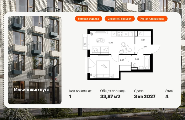 Продаётся 1-комн.квартира площадью 33.87 кв.м на 4 этаже 9 этажного дома (Корпус 4.1, секция 2) проекта ПИК Ильинские луга. Светлый просторный подъезд на уровне земли, функциональная планировка, большие окна, с отделкой. Артикул - 1015833О застройщике