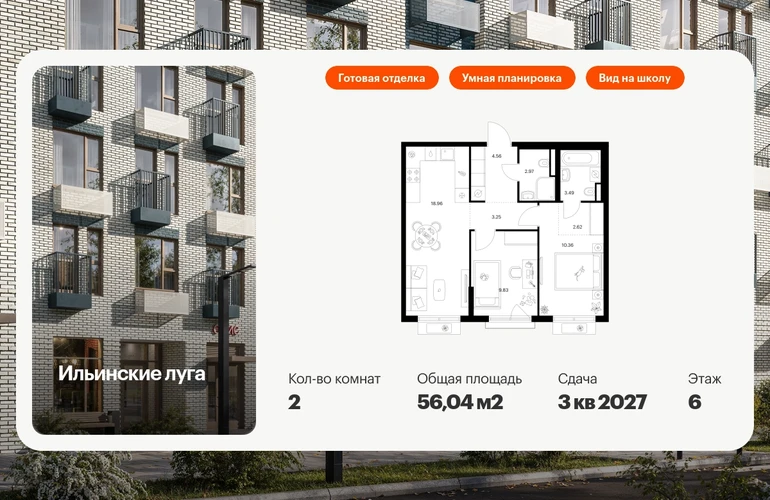 Продаётся 2-комн.квартира площадью 56.04 кв.м на 6 этаже 9 этажного дома (Корпус 4.1, секция 4) проекта ПИК Ильинские луга. Светлый просторный подъезд на уровне земли, функциональная планировка, большие окна, с отделкой. Жилой район «Ильинские луга» находится в 10 километрах от МКАД по Новорижскому шоссе, в 20 минутах на автомобиле от станций метро «Волоколамская», «Тушинская» и «Строгино». В будущем ближе к проекту, в 9 минутах пути на машине, откроется станция «Ильинская» Рублёво-Архангельской линии, которая будет соединять Арбатско-Покровскую линию и Большую кольцевую линию. «Ильинские луга» — масштабный проект, в который входит девять детских садов, четыре школы и поликлиника. Он строится в престижном и экологичном районе среди лесов и памятников природы. За 5 минут от жилого квартала можно доехать до Рублёво-Успенского шоссе, а за 30 минут — до центра Москвы. До крупного торгового центра «РИГАМОЛЛ» всего 5 минут на автомобиле, а до ТЦ «Твой дом» и гипермаркета «Глобус» — 10 минут. В «Ильинских лугах» строятся только девятиэтажные дома — такая архитектура соответствует спокойной жизни за городом. В каждом дворе-парке есть места для отдыха, детские и спортивные площадки. А ещё, здесь уже открыт большой PlayHub «Гравити» — современное игровое пространство с космической тематикой, холмами, зонами для игр и отдыха жителей любого возраста. На первых этажах уже работают магазины, кафе и пекарни. Места для отдыха от «Ильинских лугов» тоже недалеко: 10 минут на машине — и вы в музее-усадьбе «Архангельское». Также рядом находится Лохин остров — памятник природы, где водятся речные черепахи, есть места для кемпинга и возможность сплавиться по реке. Артикул - 1016087О застройщике
