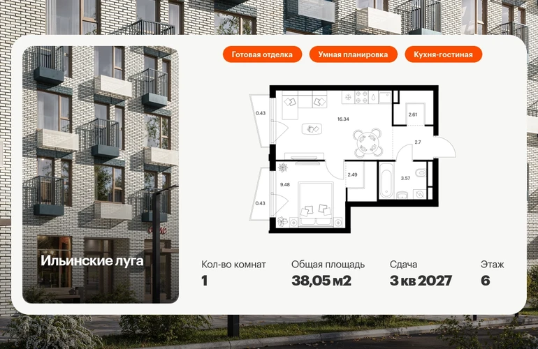 Продаётся 1-комн.квартира площадью 38.05 кв.м на 6 этаже 9 этажного дома (Корпус 4.2, секция 2) проекта ПИК Ильинские луга. Светлый просторный подъезд на уровне земли, функциональная планировка, большие окна, с отделкой. Жилой район «Ильинские луга» находится в 10 километрах от МКАД по Новорижскому шоссе, в 20 минутах на автомобиле от станций метро «Волоколамская», «Тушинская» и «Строгино». В будущем ближе к проекту, в 9 минутах пути на машине, откроется станция «Ильинская» Рублёво-Архангельской линии, которая будет соединять Арбатско-Покровскую линию и Большую кольцевую линию. «Ильинские луга» — масштабный проект, в который входит девять детских садов, четыре школы и поликлиника. Он строится в престижном и экологичном районе среди лесов и памятников природы. За 5 минут от жилого квартала можно доехать до Рублёво-Успенского шоссе, а за 30 минут — до центра Москвы. До крупного торгового центра «РИГАМОЛЛ» всего 5 минут на автомобиле, а до ТЦ «Твой дом» и гипермаркета «Глобус» — 10 минут. В «Ильинских лугах» строятся только девятиэтажные дома — такая архитектура соответствует спокойной жизни за городом. В каждом дворе-парке есть места для отдыха, детские и спортивные площадки. А ещё, здесь уже открыт большой PlayHub «Гравити» — современное игровое пространство с космической тематикой, холмами, зонами для игр и отдыха жителей любого возраста. На первых этажах уже работают магазины, кафе и пекарни. Места для отдыха от «Ильинских лугов» тоже недалеко: 10 минут на машине — и вы в музее-усадьбе «Архангельское». Также рядом находится Лохин остров — памятник природы, где водятся речные черепахи, есть места для кемпинга и возможность сплавиться по реке. Артикул - 1015451О застройщике