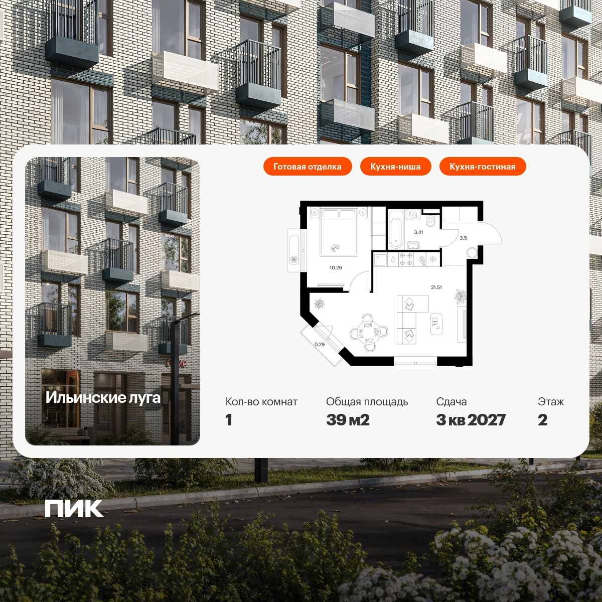 Продаётся 1-комн.квартира площадью 39.00 кв.м на 2 этаже 9 этажного дома (Корпус 4.2, секция 2) проекта ПИК Ильинские луга. Светлый просторный подъезд на уровне земли, функциональная планировка, большие окна, с отделкой. Жилой район «Ильинские луга» находится в 10 километрах от МКАД по Новорижскому шоссе, в 20 минутах на автомобиле от станций метро «Волоколамская», «Тушинская» и «Строгино». В будущем ближе к проекту, в 9 минутах пути на машине, откроется станция «Ильинская» Рублёво-Архангельской линии, которая будет соединять Арбатско-Покровскую линию и Большую кольцевую линию. «Ильинские луга» — масштабный проект, в который входит девять детских садов, четыре школы и поликлиника. Он строится в престижном и экологичном районе среди лесов и памятников природы. За 5 минут от жилого квартала можно доехать до Рублёво-Успенского шоссе, а за 30 минут — до центра Москвы. До крупного торгового центра «РИГАМОЛЛ» всего 5 минут на автомобиле, а до ТЦ «Твой дом» и гипермаркета «Глобус» — 10 минут. В «Ильинских лугах» строятся только девятиэтажные дома — такая архитектура соответствует спокойной жизни за городом. В каждом дворе-парке есть места для отдыха, детские и спортивные площадки. А ещё, здесь уже открыт большой PlayHub «Гравити» — современное игровое пространство с космической тематикой, холмами, зонами для игр и отдыха жителей любого возраста. На первых этажах уже работают магазины, кафе и пекарни. Места для отдыха от «Ильинских лугов» тоже недалеко: 10 минут на машине — и вы в музее-усадьбе «Архангельское». Также рядом находится Лохин остров — памятник природы, где водятся речные черепахи, есть места для кемпинга и возможность сплавиться по реке. Артикул - 1015392О застройщике