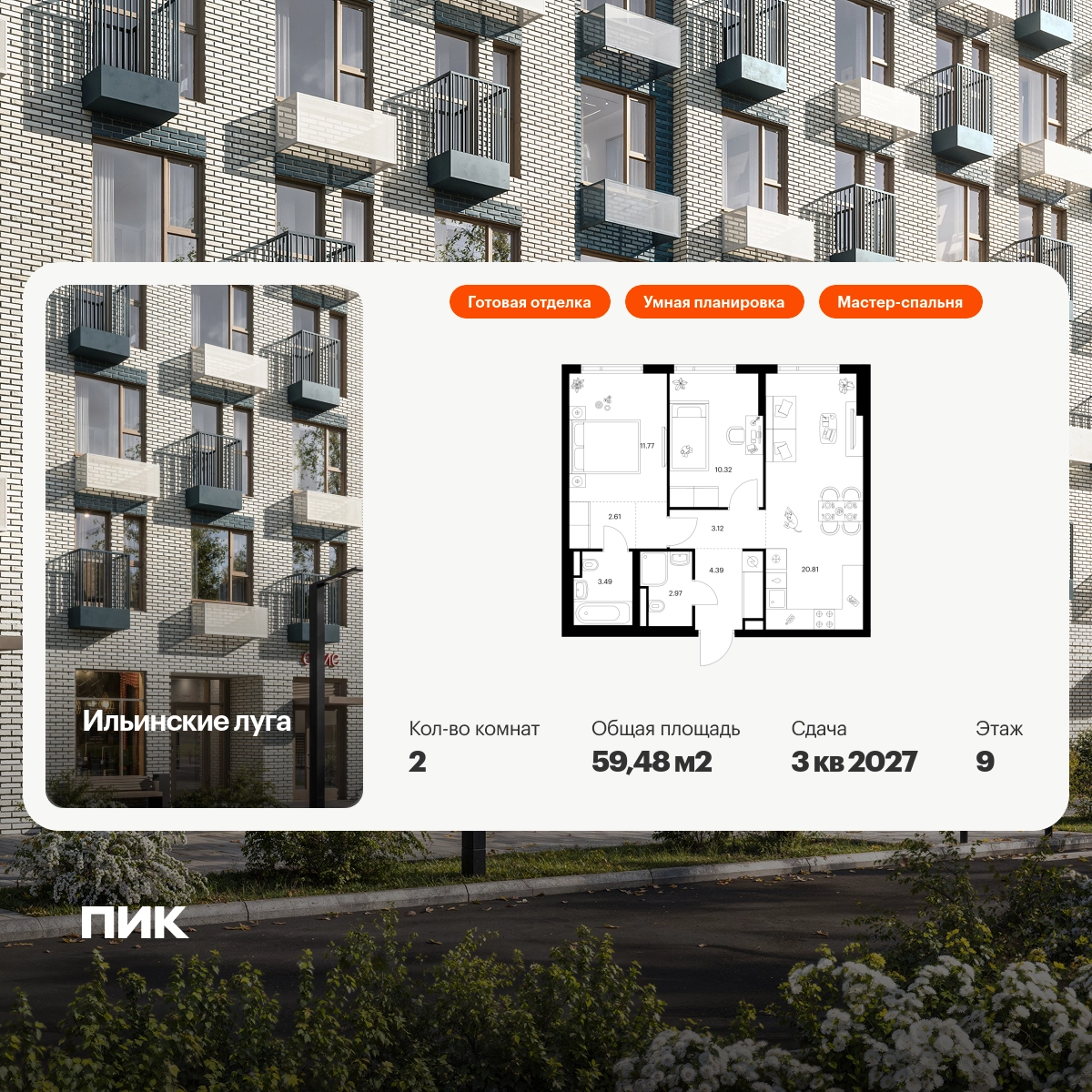 Продаётся 2-комн.квартира площадью 59.48 кв.м на 9 этаже 9 этажного дома (Корпус 4.1, секция 2) проекта ПИК Ильинские луга. Светлый просторный подъезд на уровне земли, функциональная планировка, большие окна, с отделкой. Жилой район «Ильинские луга» находится в 10 километрах от МКАД по Новорижскому шоссе, в 20 минутах на автомобиле от станций метро «Волоколамская», «Тушинская» и «Строгино». В будущем ближе к проекту, в 9 минутах пути на машине, откроется станция «Ильинская» Рублёво-Архангельской линии, которая будет соединять Арбатско-Покровскую линию и Большую кольцевую линию. «Ильинские луга» — масштабный проект, в который входит девять детских садов, четыре школы и поликлиника. Он строится в престижном и экологичном районе среди лесов и памятников природы. За 5 минут от жилого квартала можно доехать до Рублёво-Успенского шоссе, а за 30 минут — до центра Москвы. До крупного торгового центра «РИГАМОЛЛ» всего 5 минут на автомобиле, а до ТЦ «Твой дом» и гипермаркета «Глобус» — 10 минут. В «Ильинских лугах» строятся только девятиэтажные дома — такая архитектура соответствует спокойной жизни за городом. В каждом дворе-парке есть места для отдыха, детские и спортивные площадки. А ещё, здесь уже открыт большой PlayHub «Гравити» — современное игровое пространство с космической тематикой, холмами, зонами для игр и отдыха жителей любого возраста. На первых этажах уже работают магазины, кафе и пекарни. Места для отдыха от «Ильинских лугов» тоже недалеко: 10 минут на машине — и вы в музее-усадьбе «Архангельское». Также рядом находится Лохин остров — памятник природы, где водятся речные черепахи, есть места для кемпинга и возможность сплавиться по реке. Артикул - 1015913О застройщике