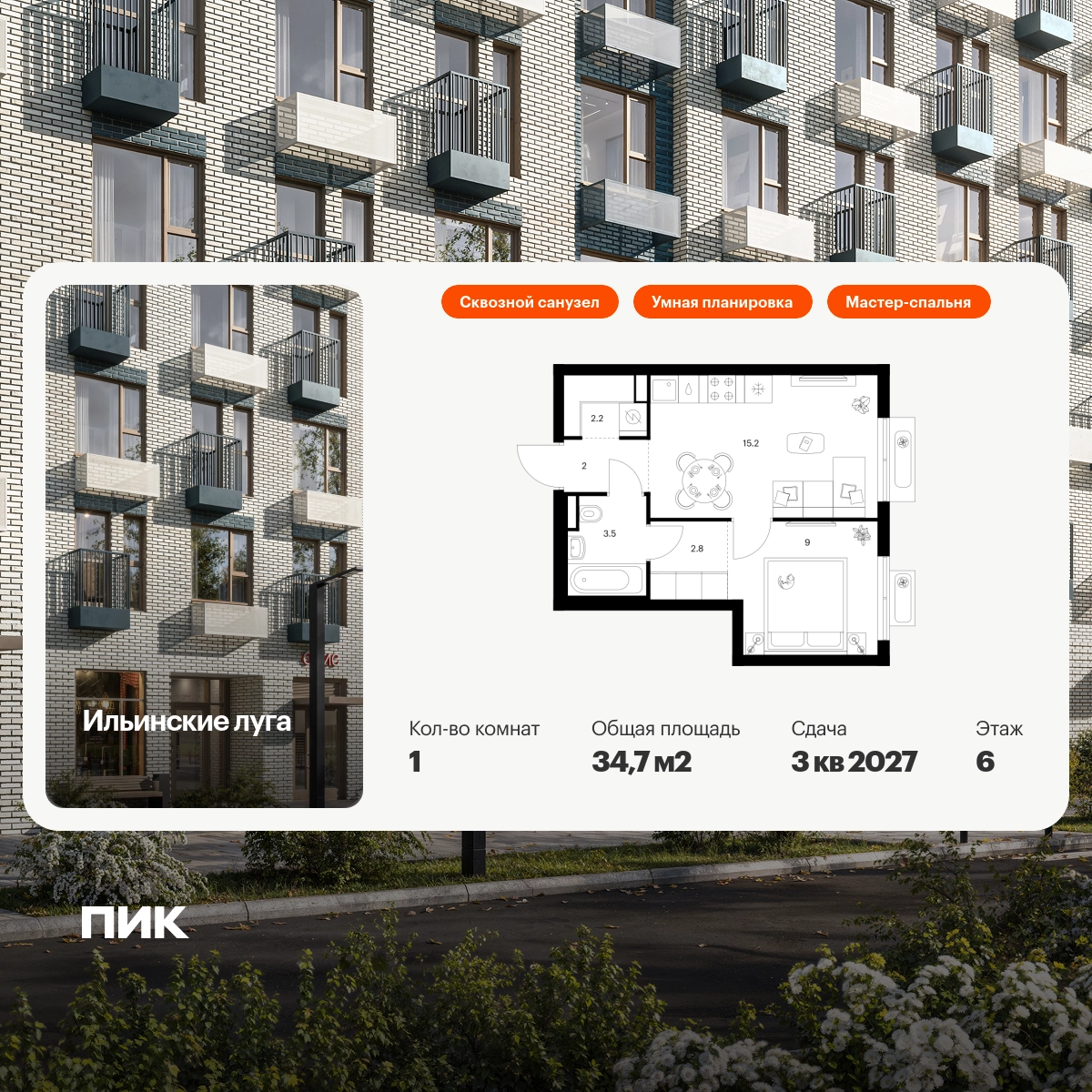 Продаётся 1-комн.квартира площадью 34.70 кв.м на 6 этаже 9 этажного дома (Корпус 4.3, секция 4) проекта ПИК Ильинские луга. Светлый просторный подъезд на уровне земли, функциональная планировка, большие окна, с отделкой. Жилой район «Ильинские луга» находится в 10 километрах от МКАД по Новорижскому шоссе, в 20 минутах на автомобиле от станций метро «Волоколамская», «Тушинская» и «Строгино». В будущем ближе к проекту, в 9 минутах пути на машине, откроется станция «Ильинская» Рублёво-Архангельской линии, которая будет соединять Арбатско-Покровскую линию и Большую кольцевую линию. «Ильинские луга» — масштабный проект, в который входит девять детских садов, четыре школы и поликлиника. Он строится в престижном и экологичном районе среди лесов и памятников природы. За 5 минут от жилого квартала можно доехать до Рублёво-Успенского шоссе, а за 30 минут — до центра Москвы. До крупного торгового центра «РИГАМОЛЛ» всего 5 минут на автомобиле, а до ТЦ «Твой дом» и гипермаркета «Глобус» — 10 минут. В «Ильинских лугах» строятся только девятиэтажные дома — такая архитектура соответствует спокойной жизни за городом. В каждом дворе-парке есть места для отдыха, детские и спортивные площадки. А ещё, здесь уже открыт большой PlayHub «Гравити» — современное игровое пространство с космической тематикой, холмами, зонами для игр и отдыха жителей любого возраста. На первых этажах уже работают магазины, кафе и пекарни. Места для отдыха от «Ильинских лугов» тоже недалеко: 10 минут на машине — и вы в музее-усадьбе «Архангельское». Также рядом находится Лохин остров — памятник природы, где водятся речные черепахи, есть места для кемпинга и возможность сплавиться по реке. Артикул - 1012157О застройщике