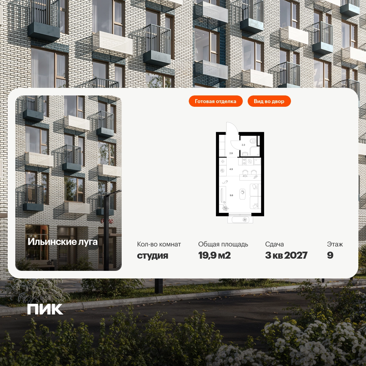 Продаётся квартира-студия площадью 19.90 кв.м на 9 этаже 9 этажного дома (Корпус 3.1, секция 2) проекта ПИК Ильинские луга. Светлый просторный подъезд на уровне земли, функциональная планировка, большие окна, с отделкой. Жилой район «Ильинские луга» находится в 10 километрах от МКАД по Новорижскому шоссе, в 20 минутах на автомобиле от станций метро «Волоколамская», «Тушинская» и «Строгино». В будущем ближе к проекту, в 9 минутах пути на машине, откроется станция «Ильинская» Рублёво-Архангельской линии, которая будет соединять Арбатско-Покровскую линию и Большую кольцевую линию. «Ильинские луга» — масштабный проект, в который входит девять детских садов, четыре школы и поликлиника. Он строится в престижном и экологичном районе среди лесов и памятников природы. За 5 минут от жилого квартала можно доехать до Рублёво-Успенского шоссе, а за 30 минут — до центра Москвы. До крупного торгового центра «РИГАМОЛЛ» всего 5 минут на автомобиле, а до ТЦ «Твой дом» и гипермаркета «Глобус» — 10 минут. В «Ильинских лугах» строятся только девятиэтажные дома — такая архитектура соответствует спокойной жизни за городом. В каждом дворе-парке есть места для отдыха, детские и спортивные площадки. А ещё, здесь уже открыт большой PlayHub «Гравити» — современное игровое пространство с космической тематикой, холмами, зонами для игр и отдыха жителей любого возраста. На первых этажах уже работают магазины, кафе и пекарни. Места для отдыха от «Ильинских лугов» тоже недалеко: 10 минут на машине — и вы в музее-усадьбе «Архангельское». Также рядом находится Лохин остров — памятник природы, где водятся речные черепахи, есть места для кемпинга и возможность сплавиться по реке. Артикул - 1001620О застройщике