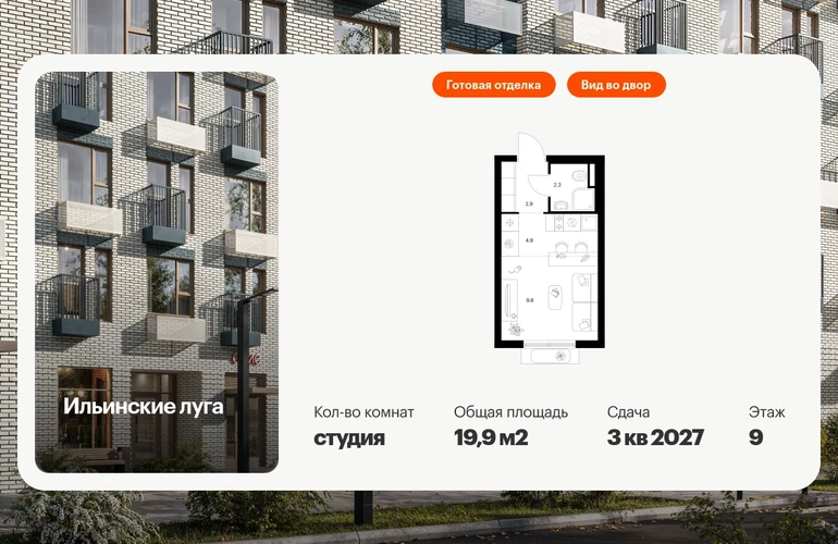 Продаётся квартира-студия площадью 19.90 кв.м на 9 этаже 9 этажного дома (Корпус 3.1, секция 2) проекта ПИК Ильинские луга. Светлый просторный подъезд на уровне земли, функциональная планировка, большие окна, с отделкой. Жилой район «Ильинские луга» находится в 10 километрах от МКАД по Новорижскому шоссе, в 20 минутах на автомобиле от станций метро «Волоколамская», «Тушинская» и «Строгино». В будущем ближе к проекту, в 9 минутах пути на машине, откроется станция «Ильинская» Рублёво-Архангельской линии, которая будет соединять Арбатско-Покровскую линию и Большую кольцевую линию. «Ильинские луга» — масштабный проект, в который входит девять детских садов, четыре школы и поликлиника. Он строится в престижном и экологичном районе среди лесов и памятников природы. За 5 минут от жилого квартала можно доехать до Рублёво-Успенского шоссе, а за 30 минут — до центра Москвы. До крупного торгового центра «РИГАМОЛЛ» всего 5 минут на автомобиле, а до ТЦ «Твой дом» и гипермаркета «Глобус» — 10 минут. В «Ильинских лугах» строятся только девятиэтажные дома — такая архитектура соответствует спокойной жизни за городом. В каждом дворе-парке есть места для отдыха, детские и спортивные площадки. А ещё, здесь уже открыт большой PlayHub «Гравити» — современное игровое пространство с космической тематикой, холмами, зонами для игр и отдыха жителей любого возраста. На первых этажах уже работают магазины, кафе и пекарни. Места для отдыха от «Ильинских лугов» тоже недалеко: 10 минут на машине — и вы в музее-усадьбе «Архангельское». Также рядом находится Лохин остров — памятник природы, где водятся речные черепахи, есть места для кемпинга и возможность сплавиться по реке. Артикул - 1001620О застройщике